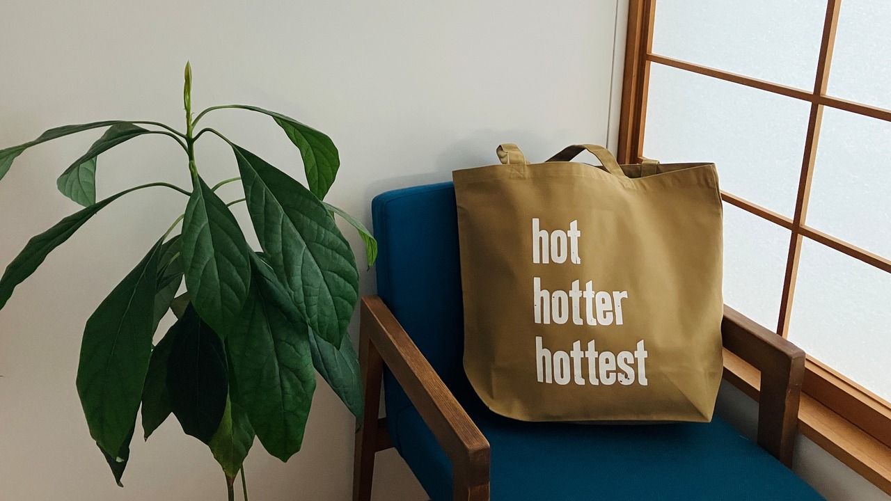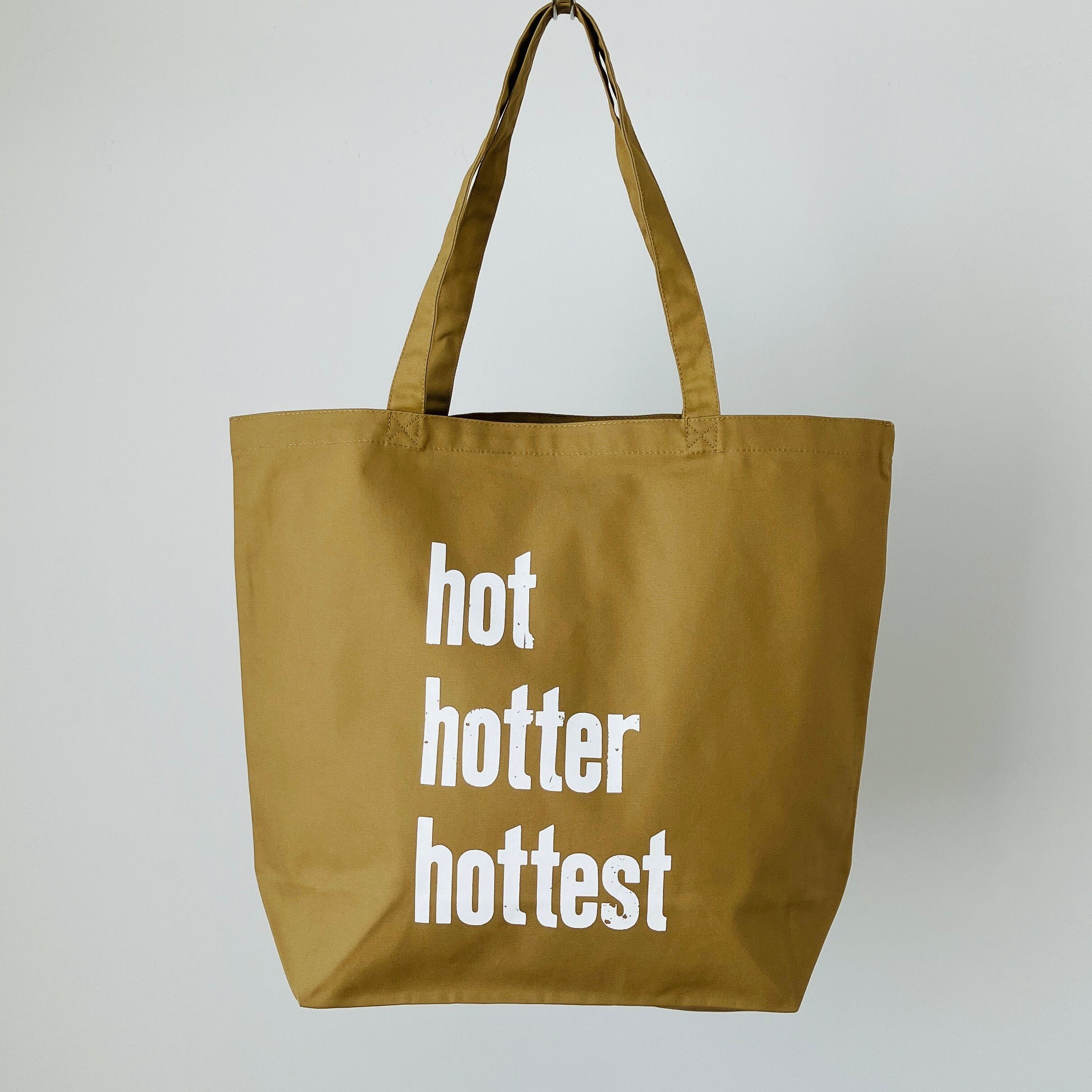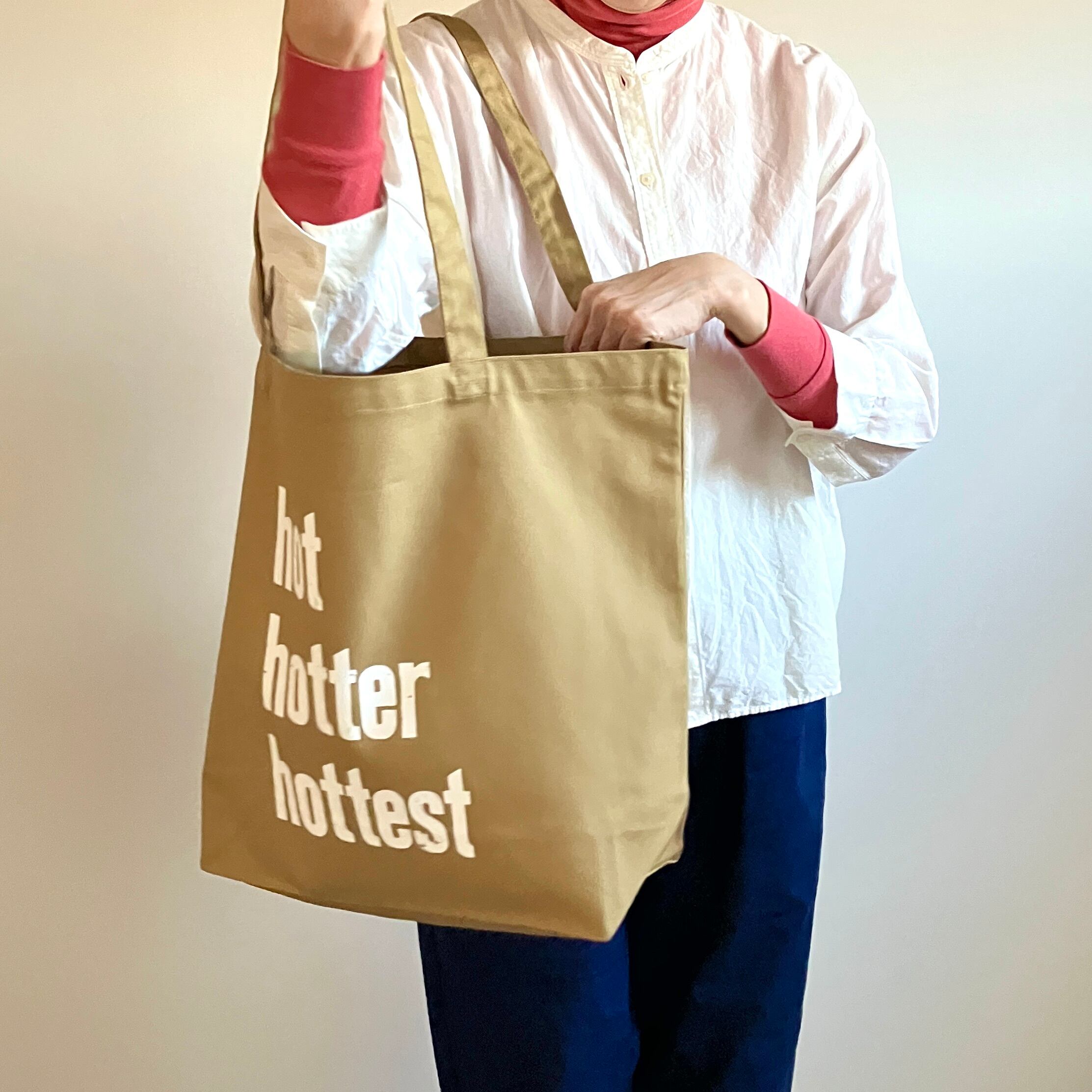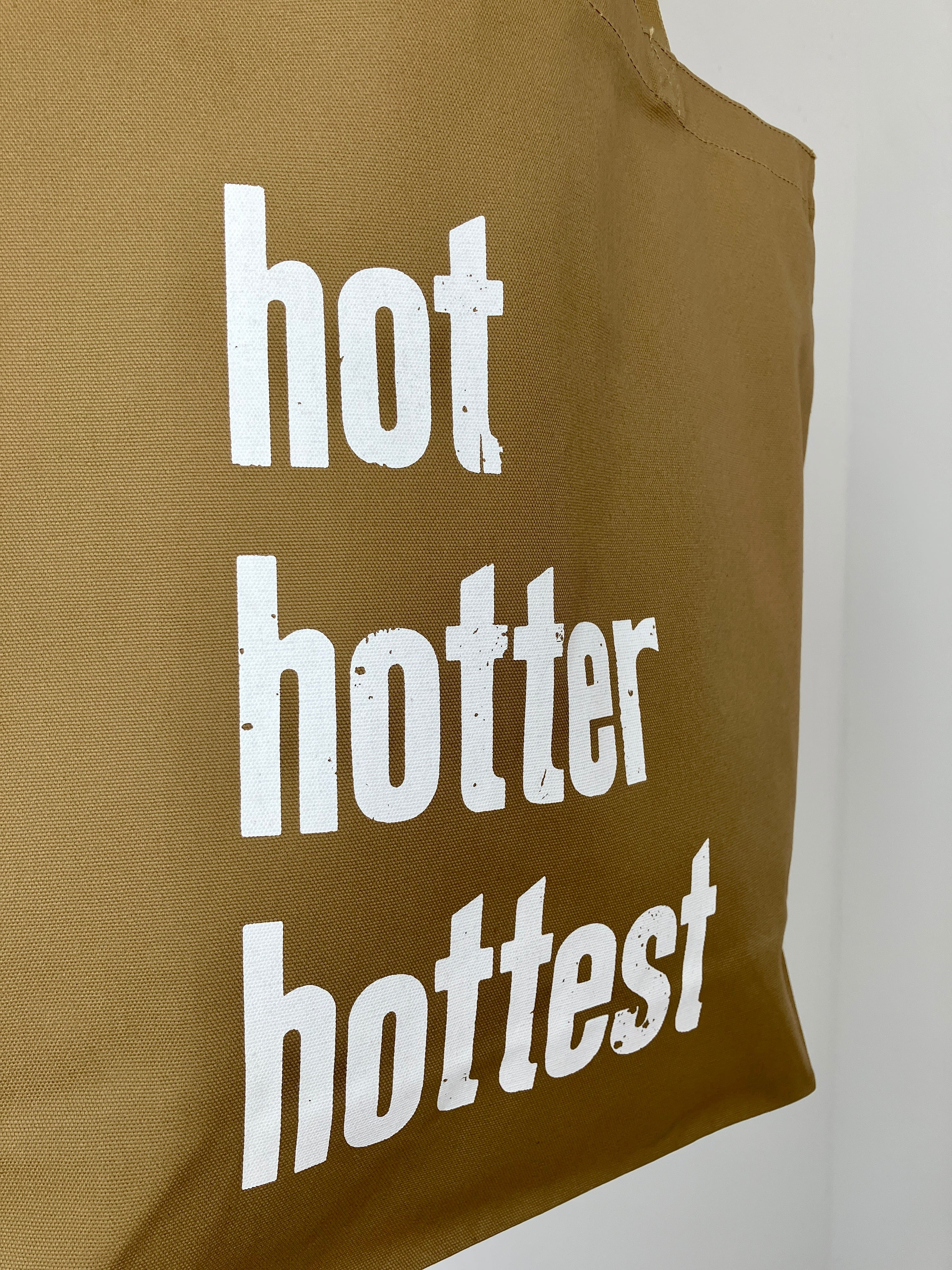バッグには木活字で活版印刷したhot hotter hottestの文字を白インクでシルクスクリーンプリントしました。木活字ならではのかすれた文字がインパクト大!