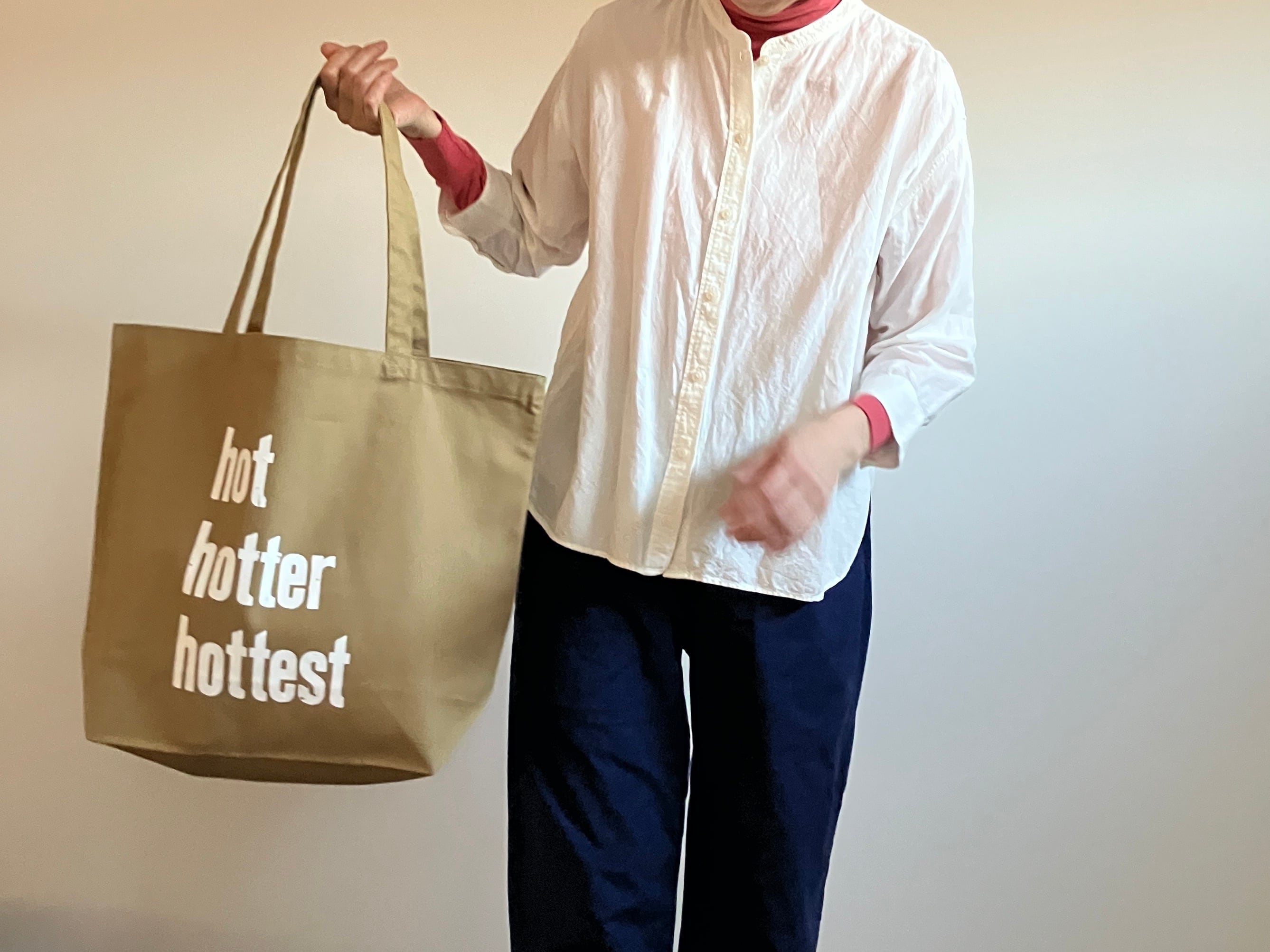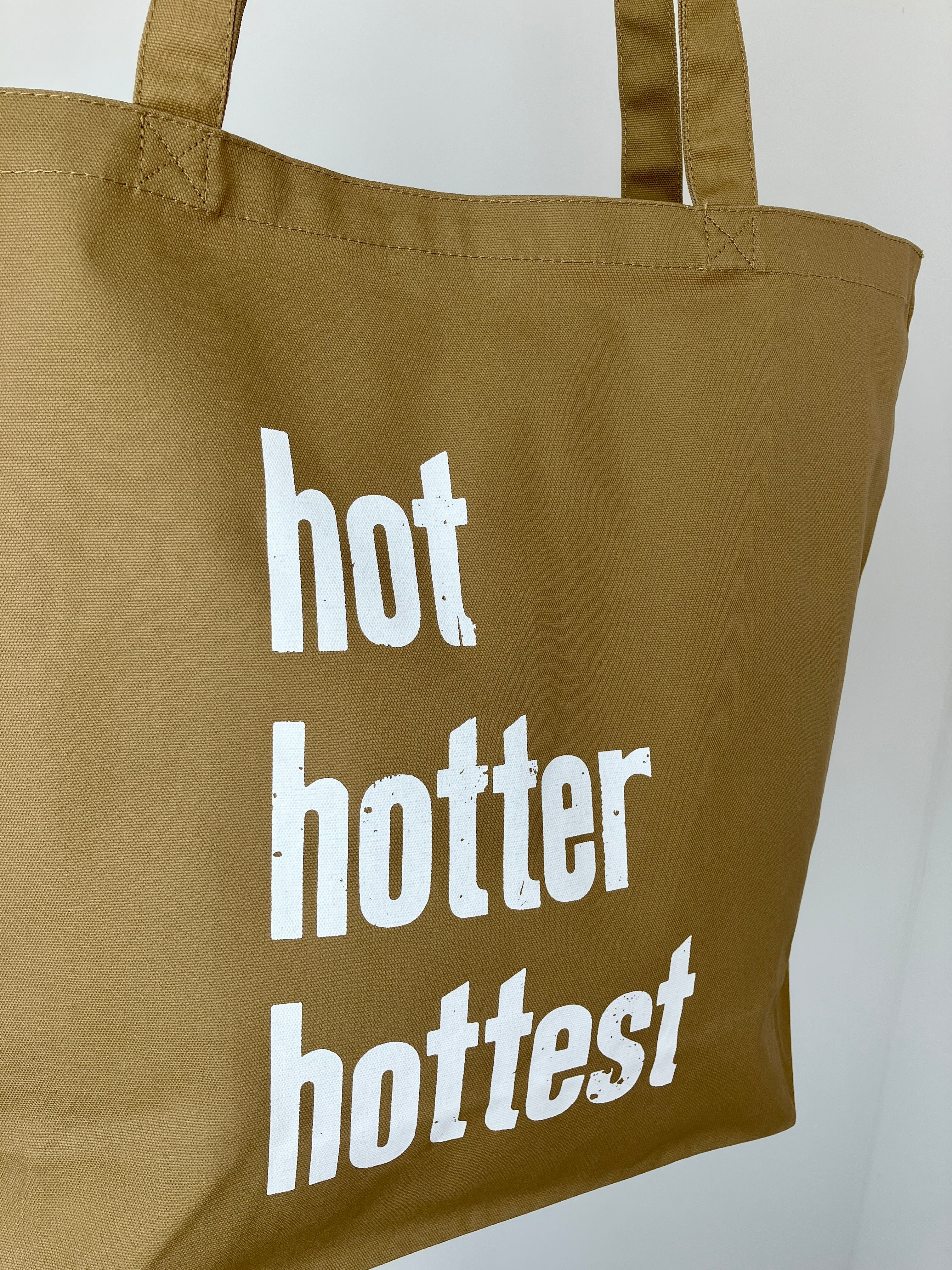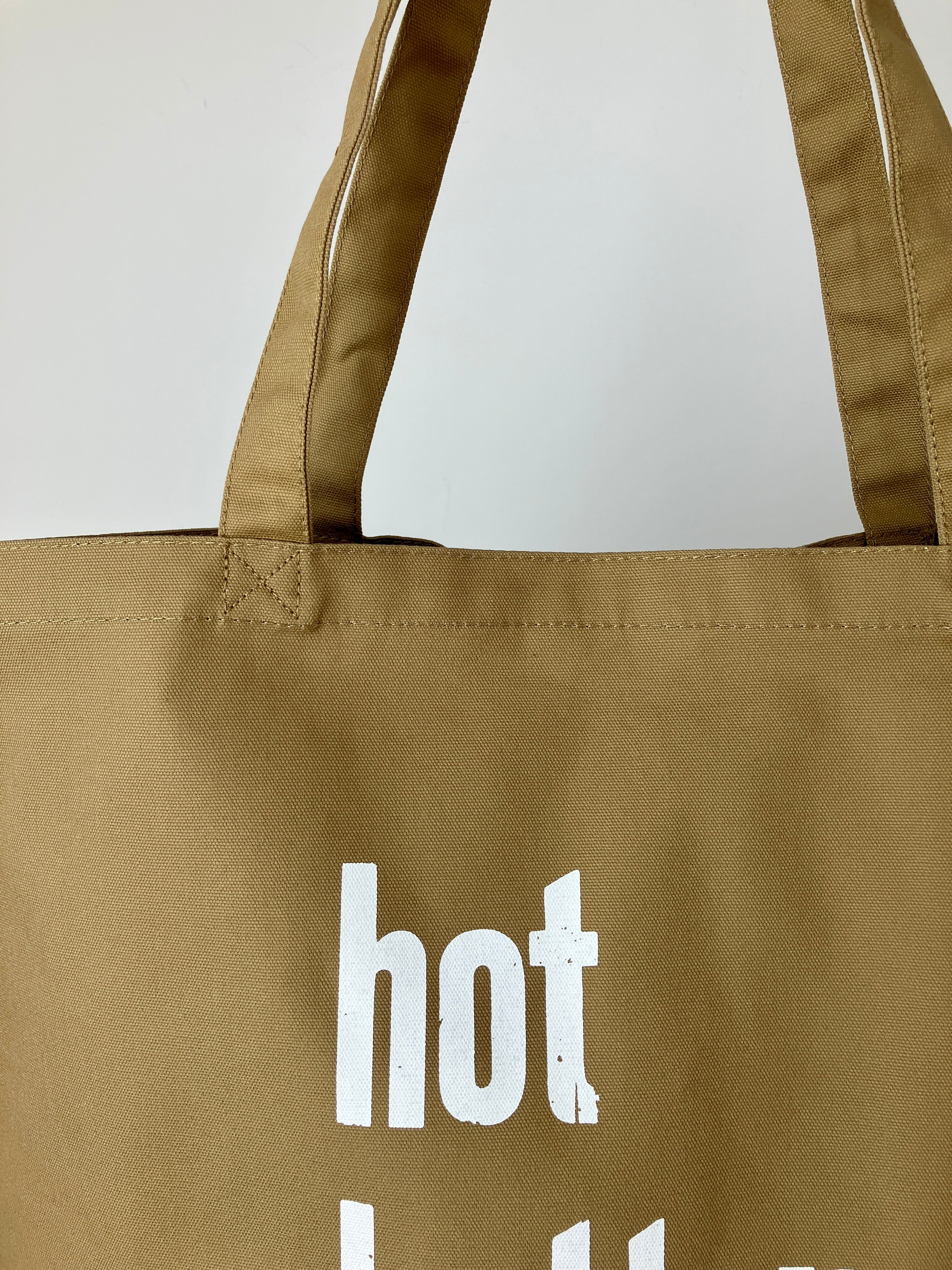 バッグには木活字で活版印刷したhot hotter hottestの文字を白インクでシルクスクリーンプリントしました。木活字ならではのかすれた文字がインパクト大!