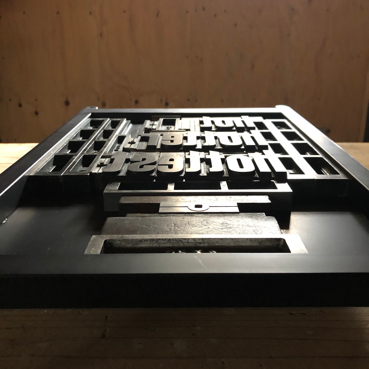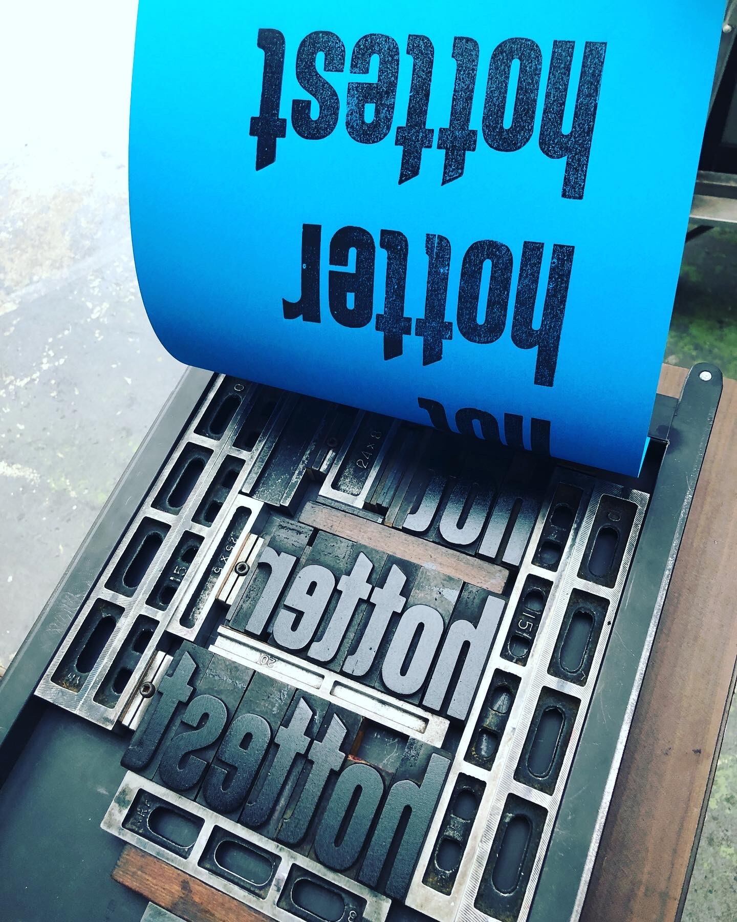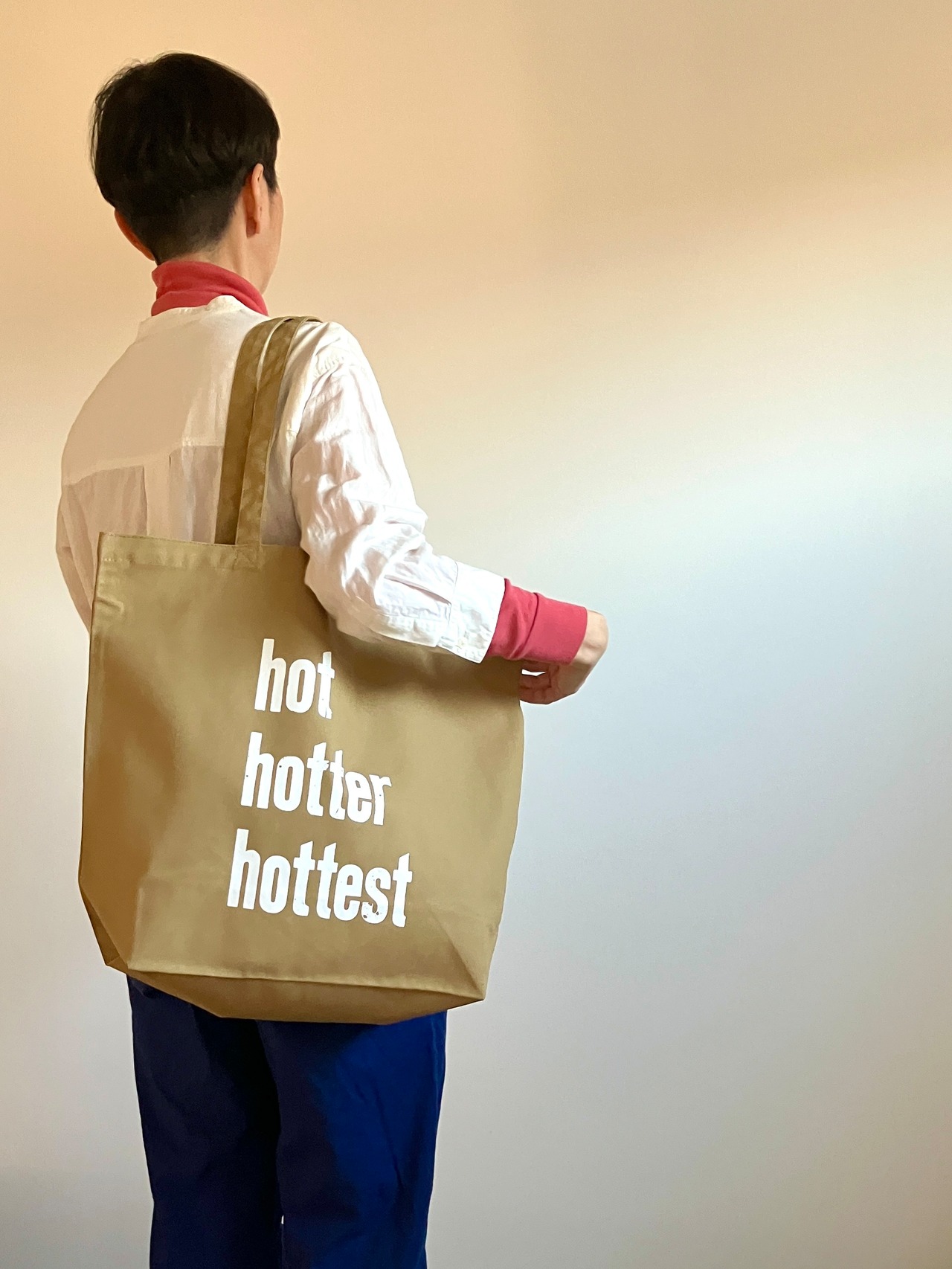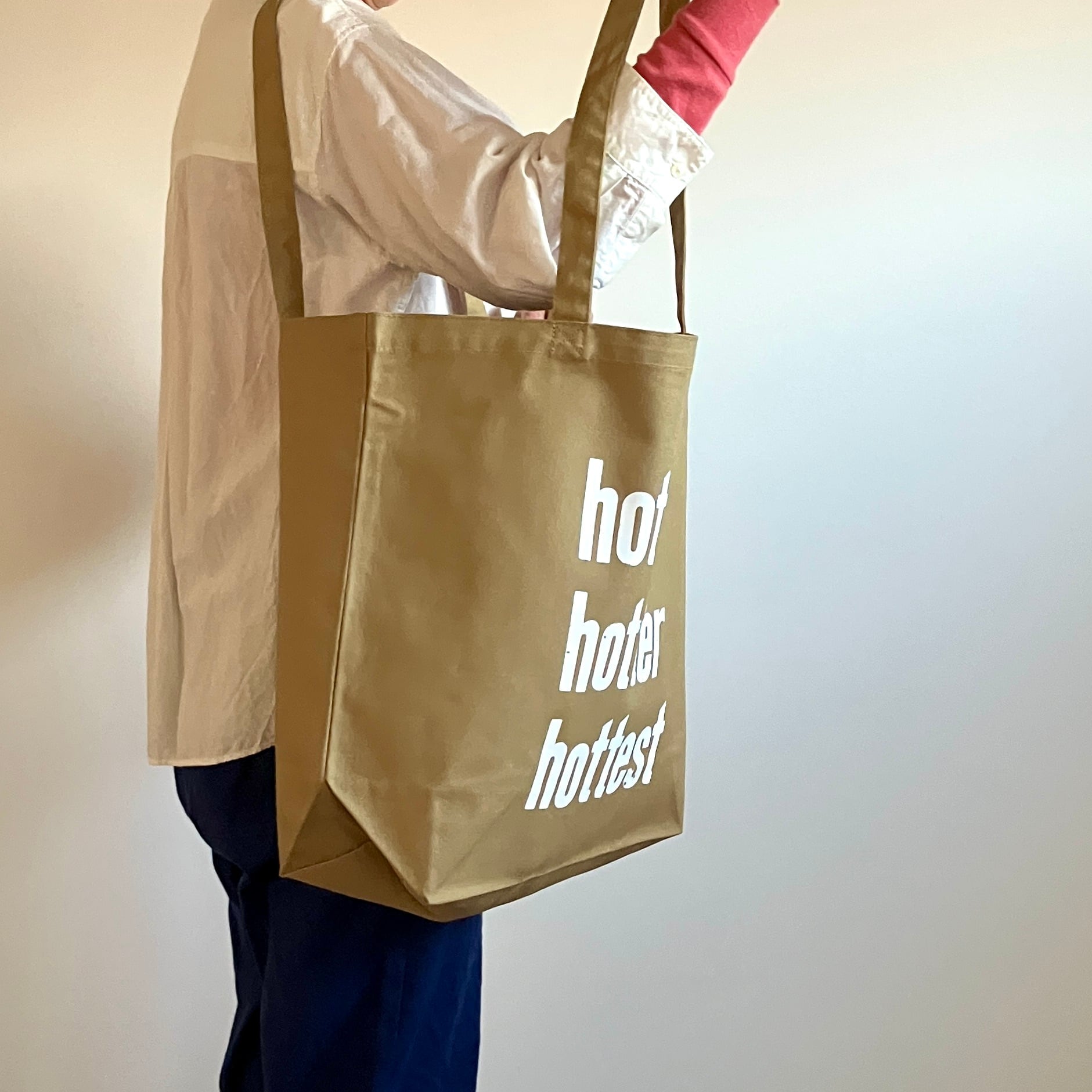 バッグには木活字で活版印刷したhot hotter hottestの文字を白インクでシルクスクリーンプリントしました。木活字ならではのかすれた文字がインパクト大!