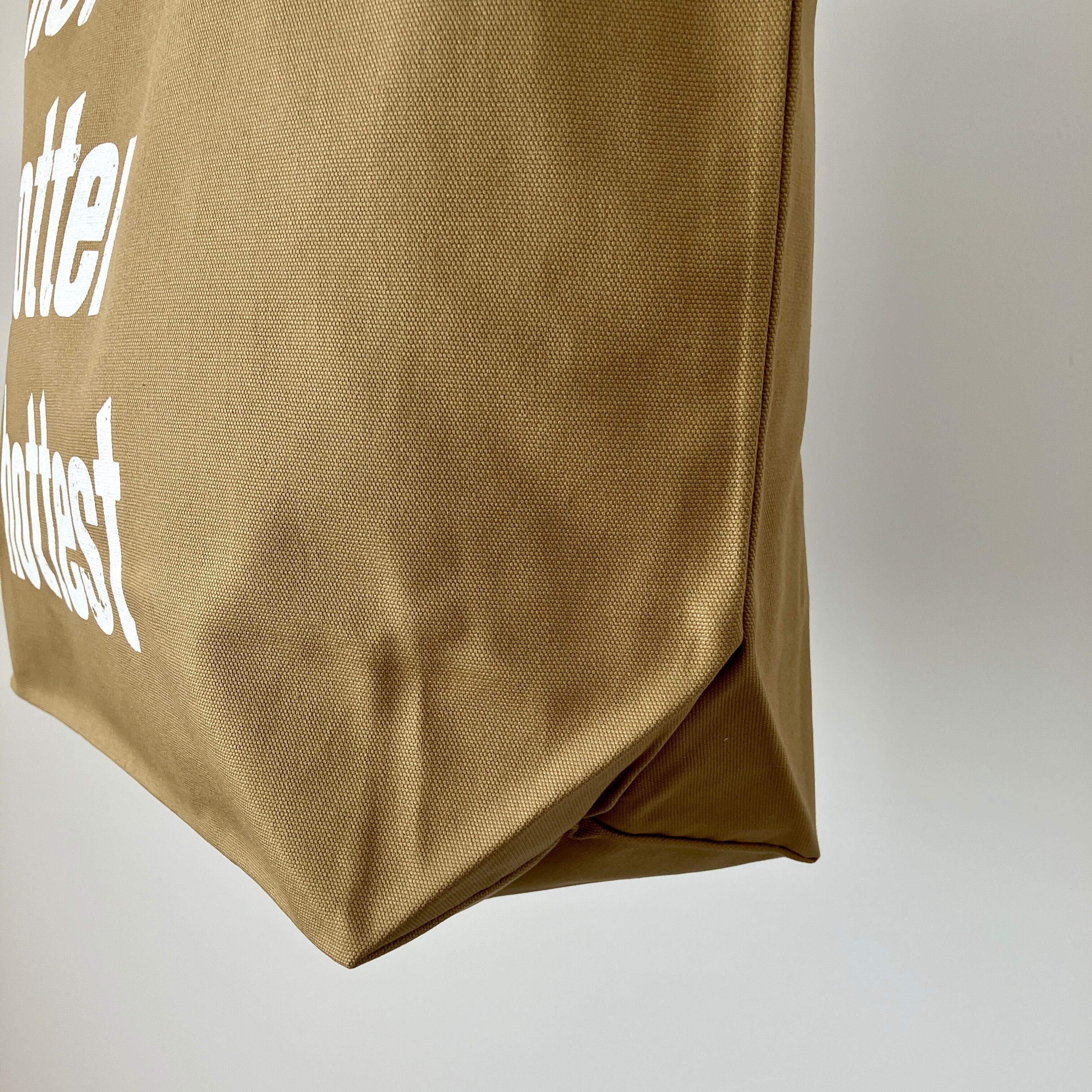 カフェオレのような濃いめのベージュに白い文字の組み合わせはどんなお洋服にも合わせやすく、大活躍すること間違いなしのバッグです。