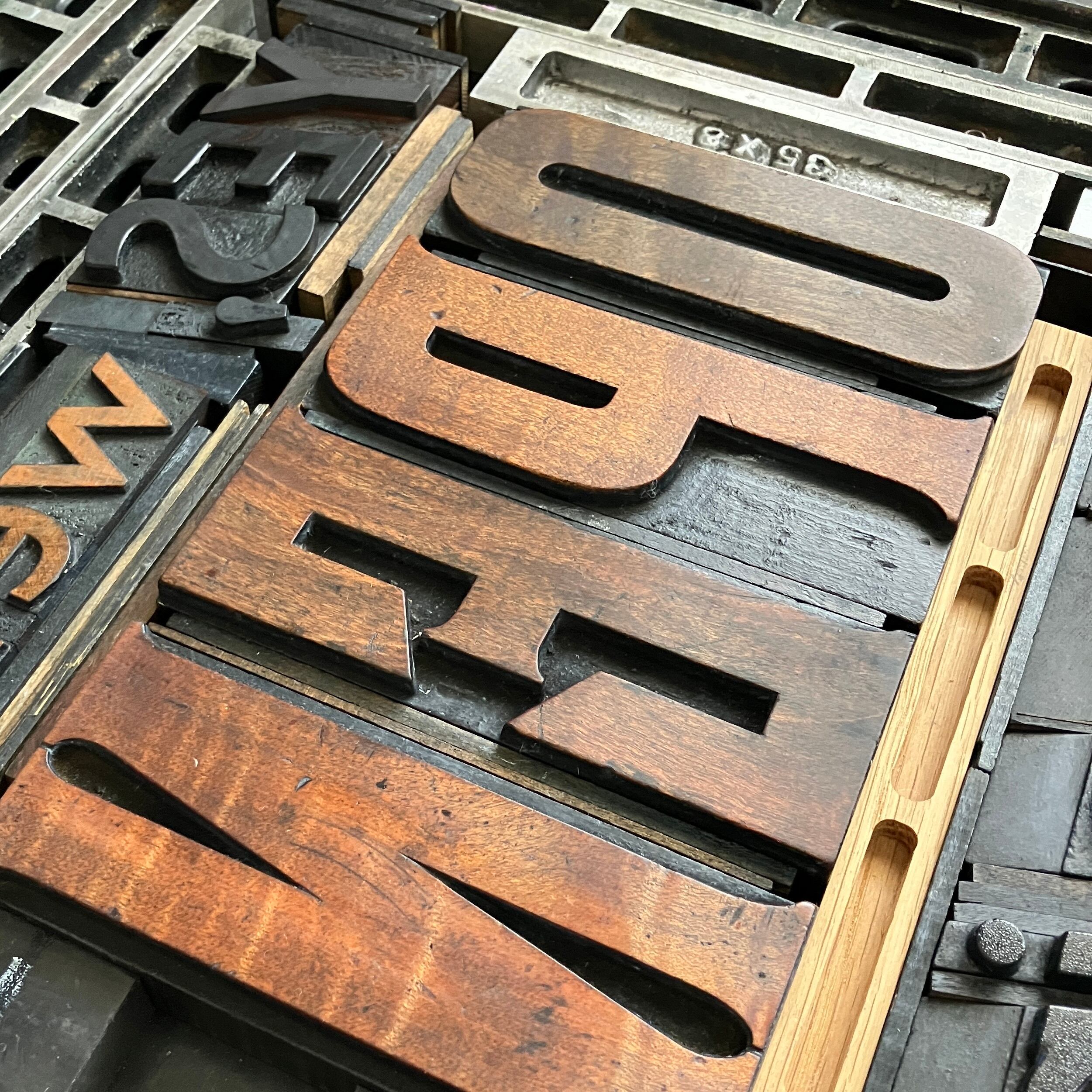 ポスターは、古い木活字と活版印刷機を使って、一枚一枚手刷りで印刷しています。インクの色はBKとWHの2色刷りです。インクのコントラストや、木活字ならではの文字のかすれ具合や木目などの風合いをお楽しみください。