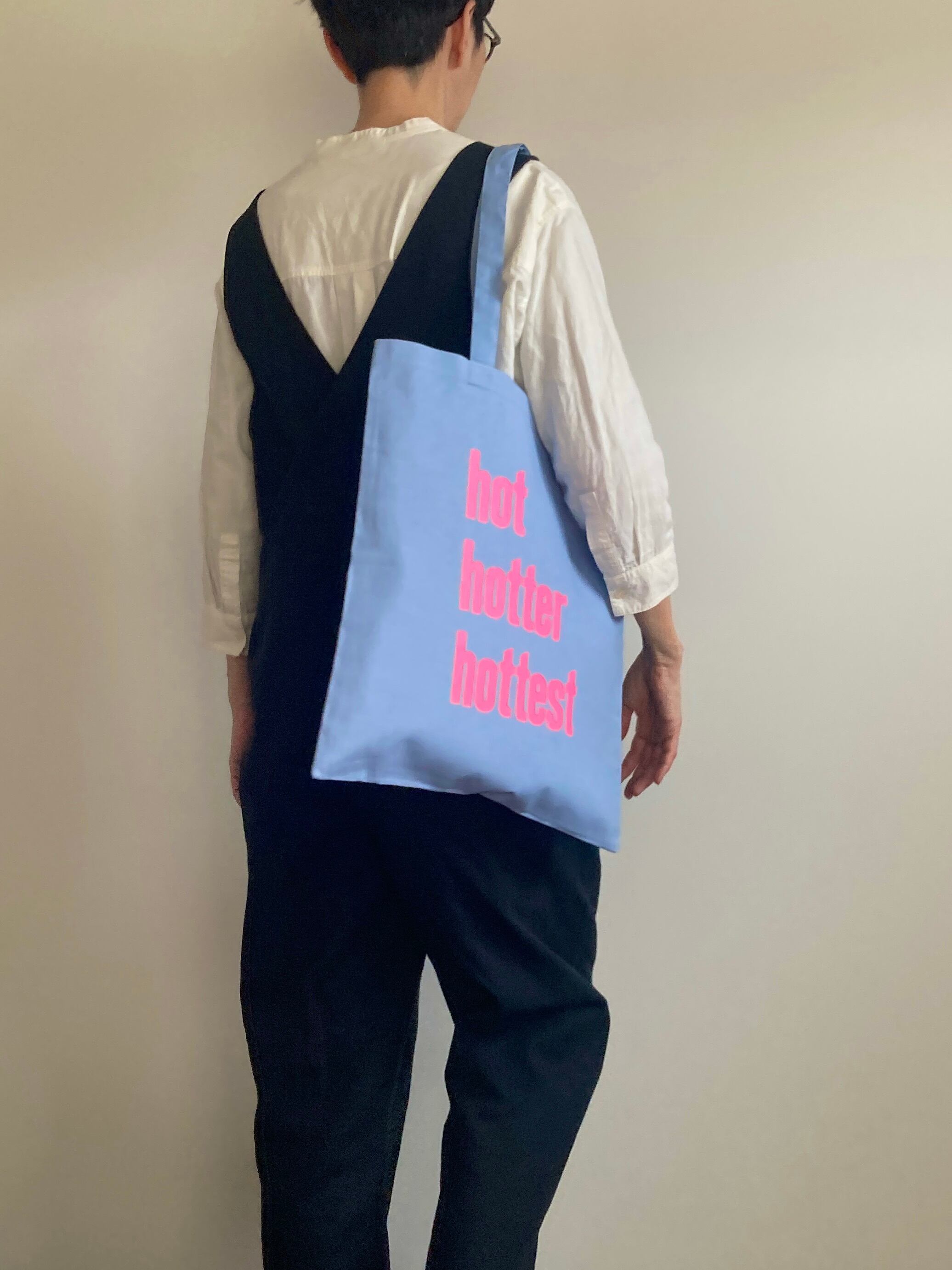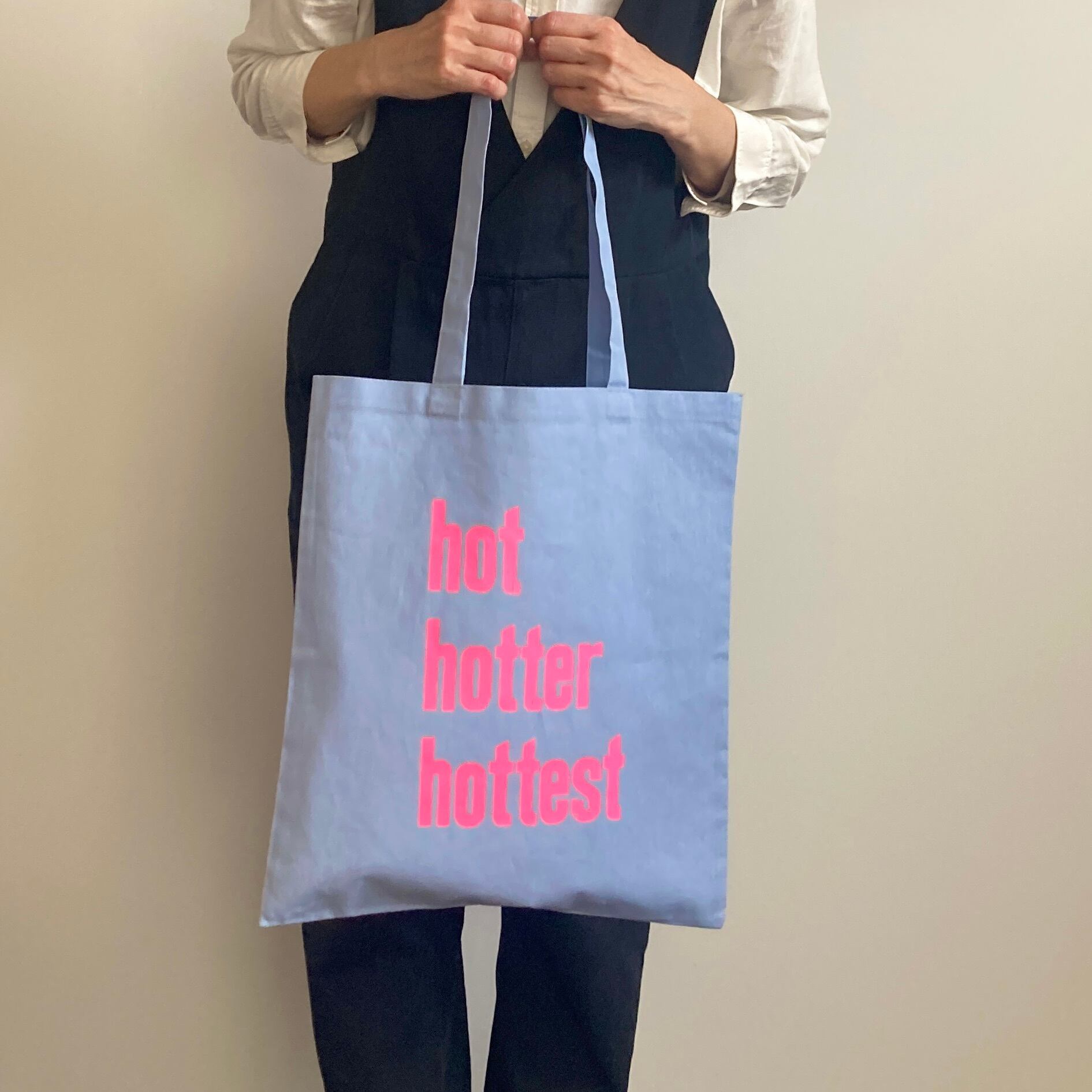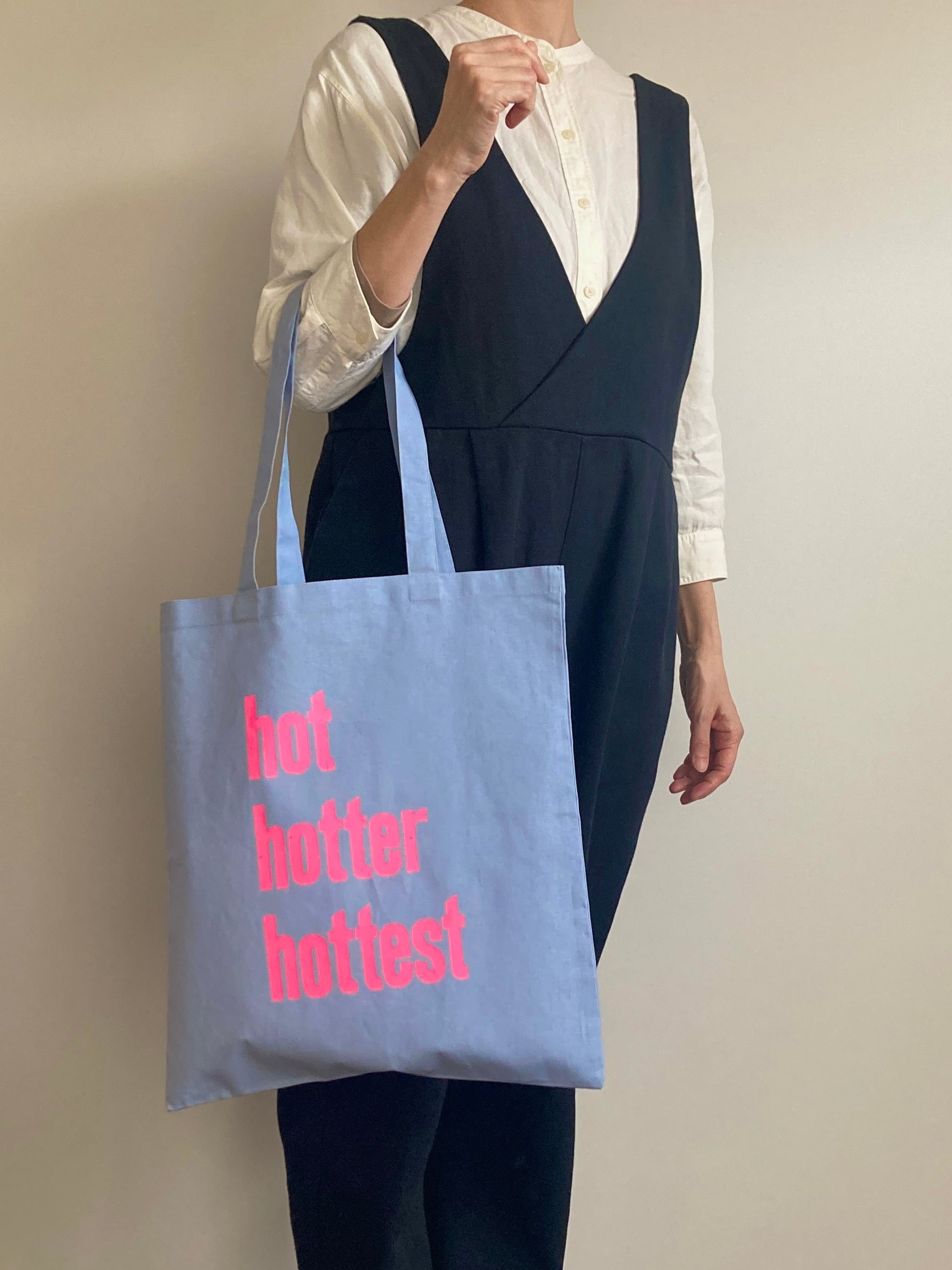 バッグには木活字で活版印刷したhot hotter hottestの文字をシルクスクリーンプリントしました。木活字ならではのかすれた文字が魅力です。