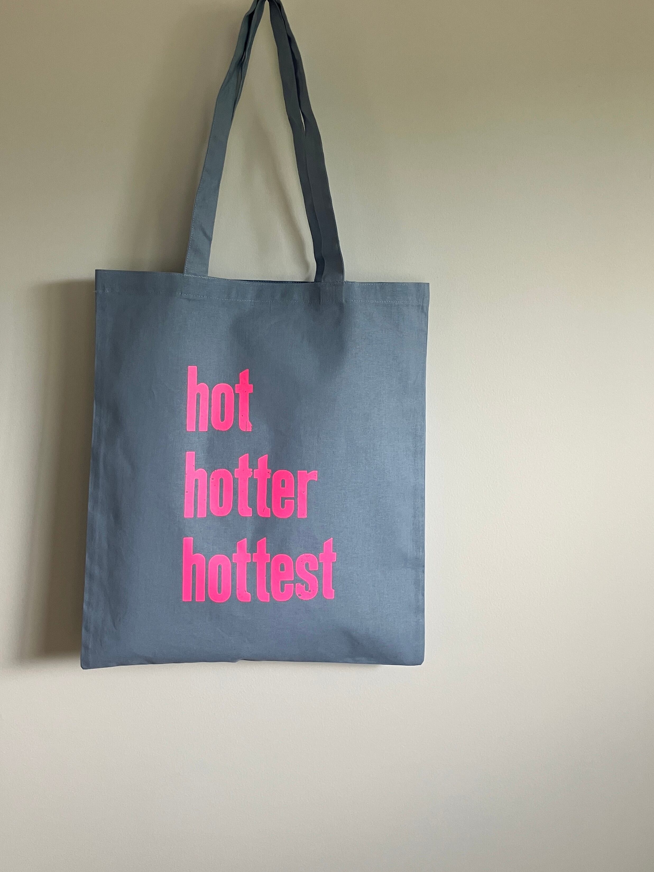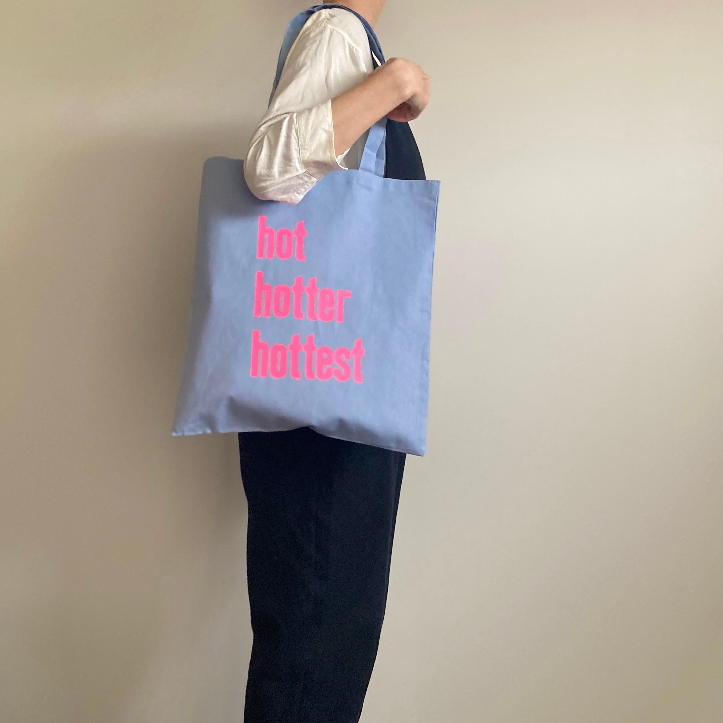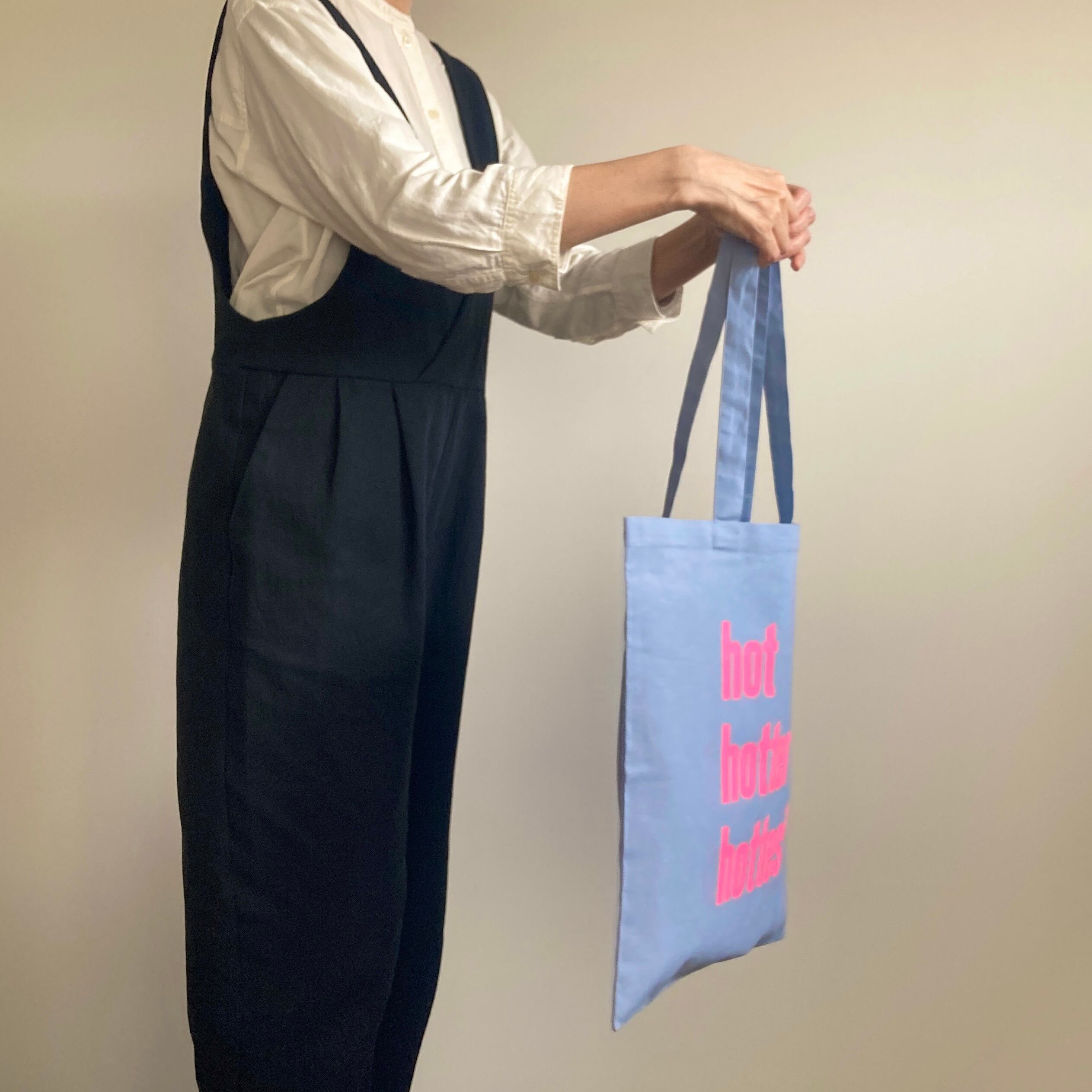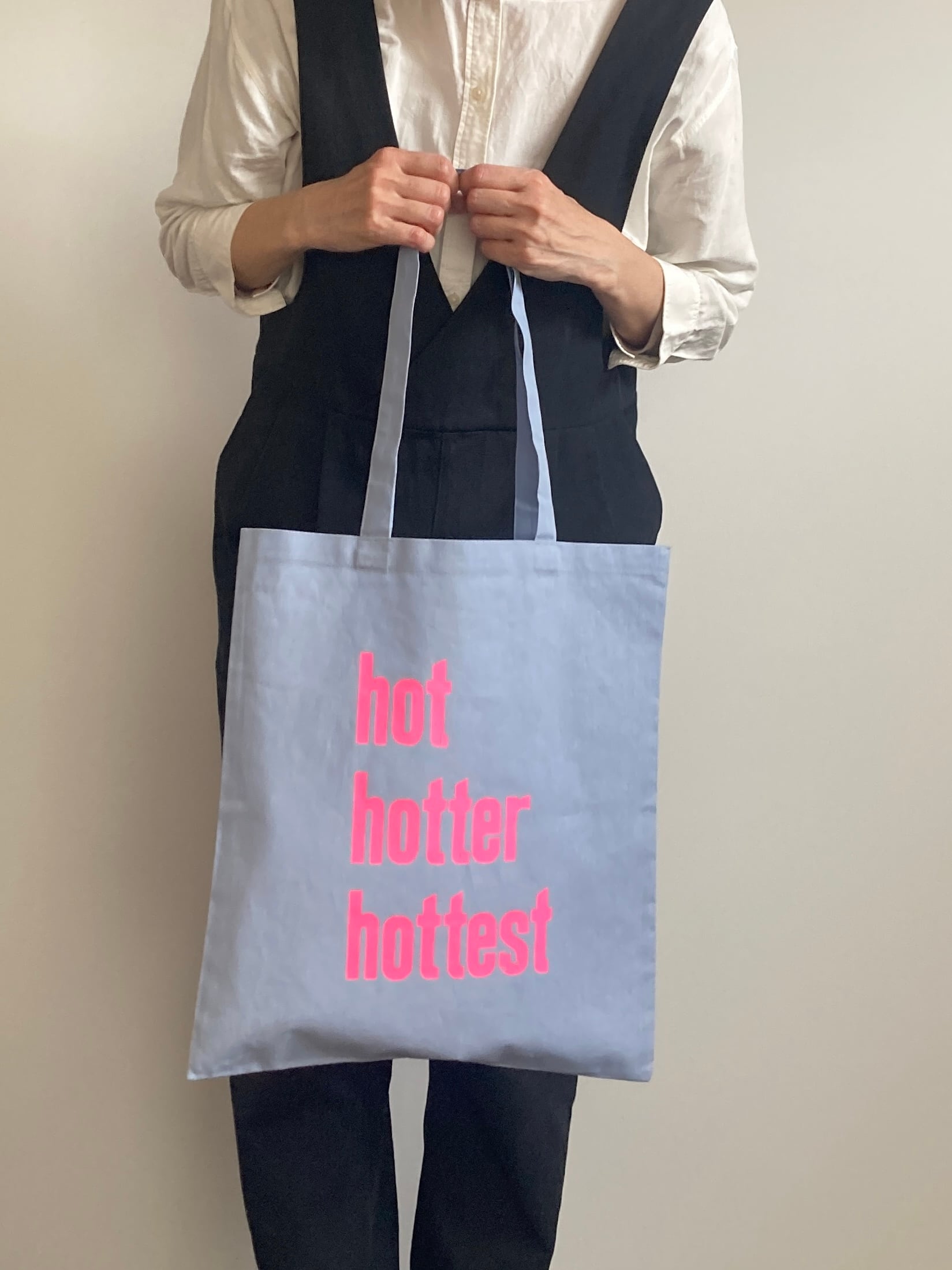バッグには木活字で活版印刷したhot hotter hottestの文字をシルクスクリーンプリントしました。木活字ならではのかすれた文字が魅力です。