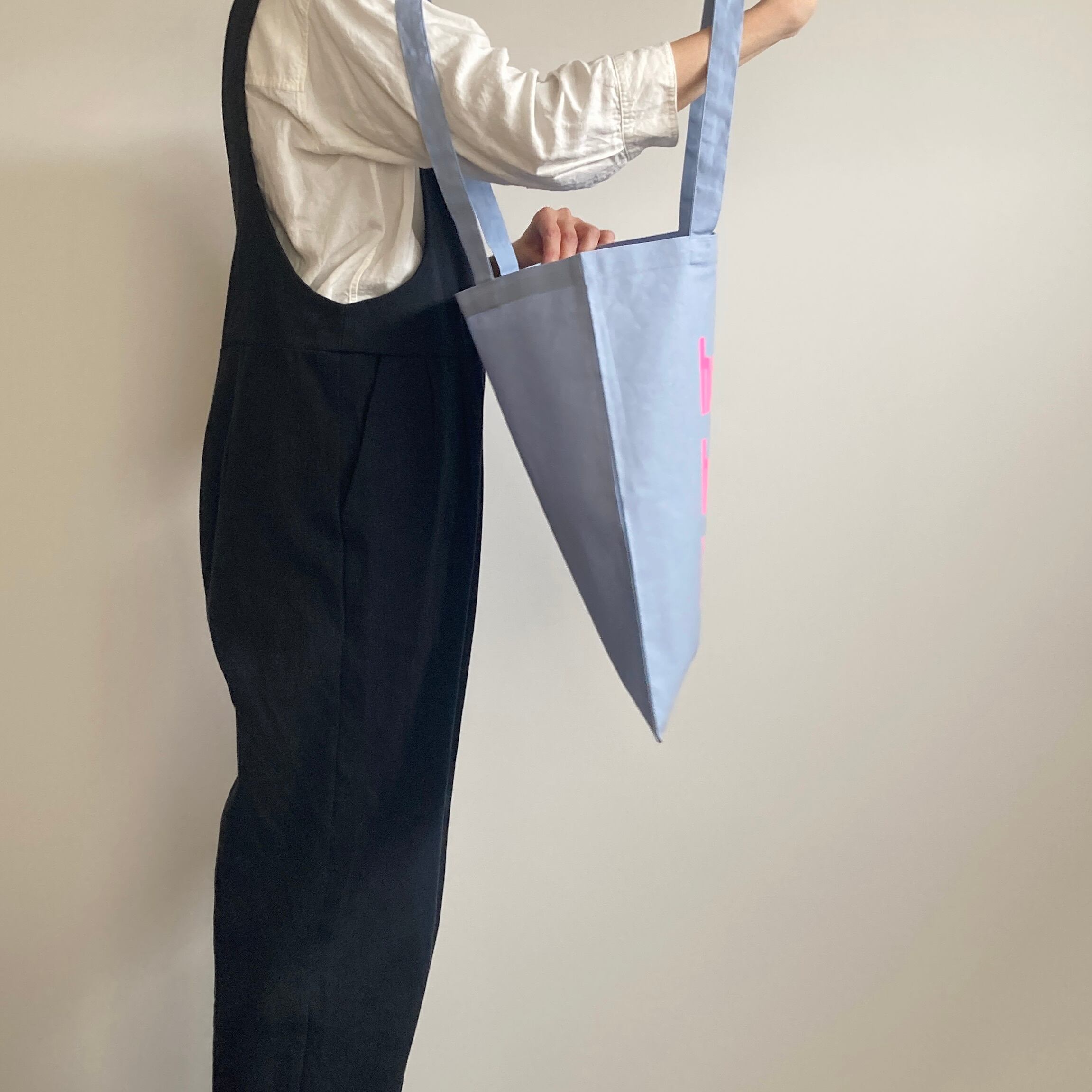 ややグレーがかった水色のバッグにパッと目を引くビビッドな蛍光ピンクの文字が映える、絶妙な色合わせのバッグです。