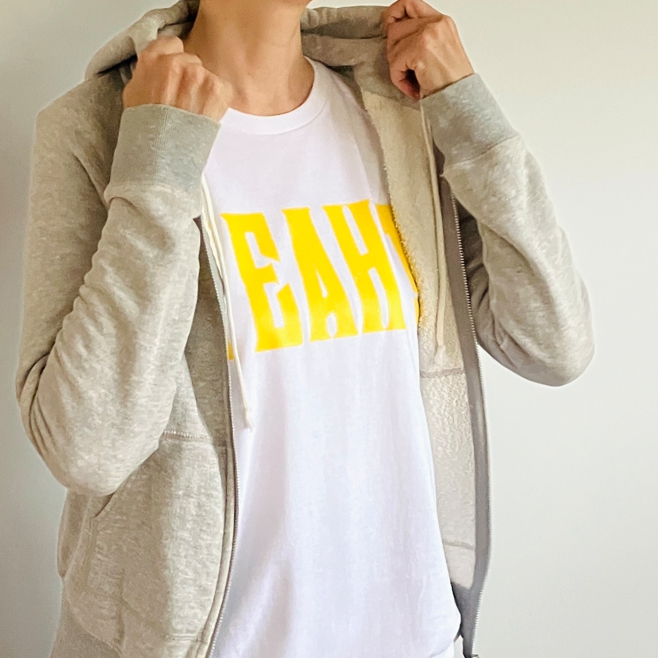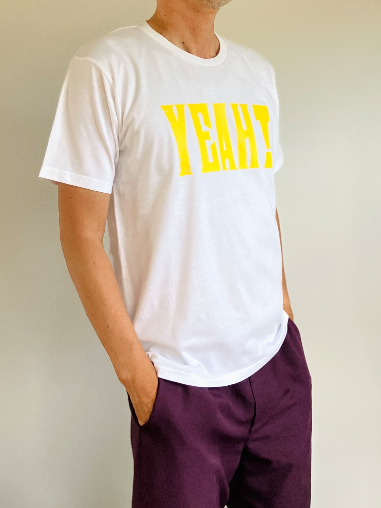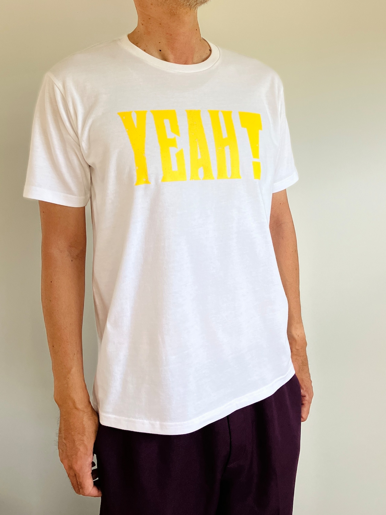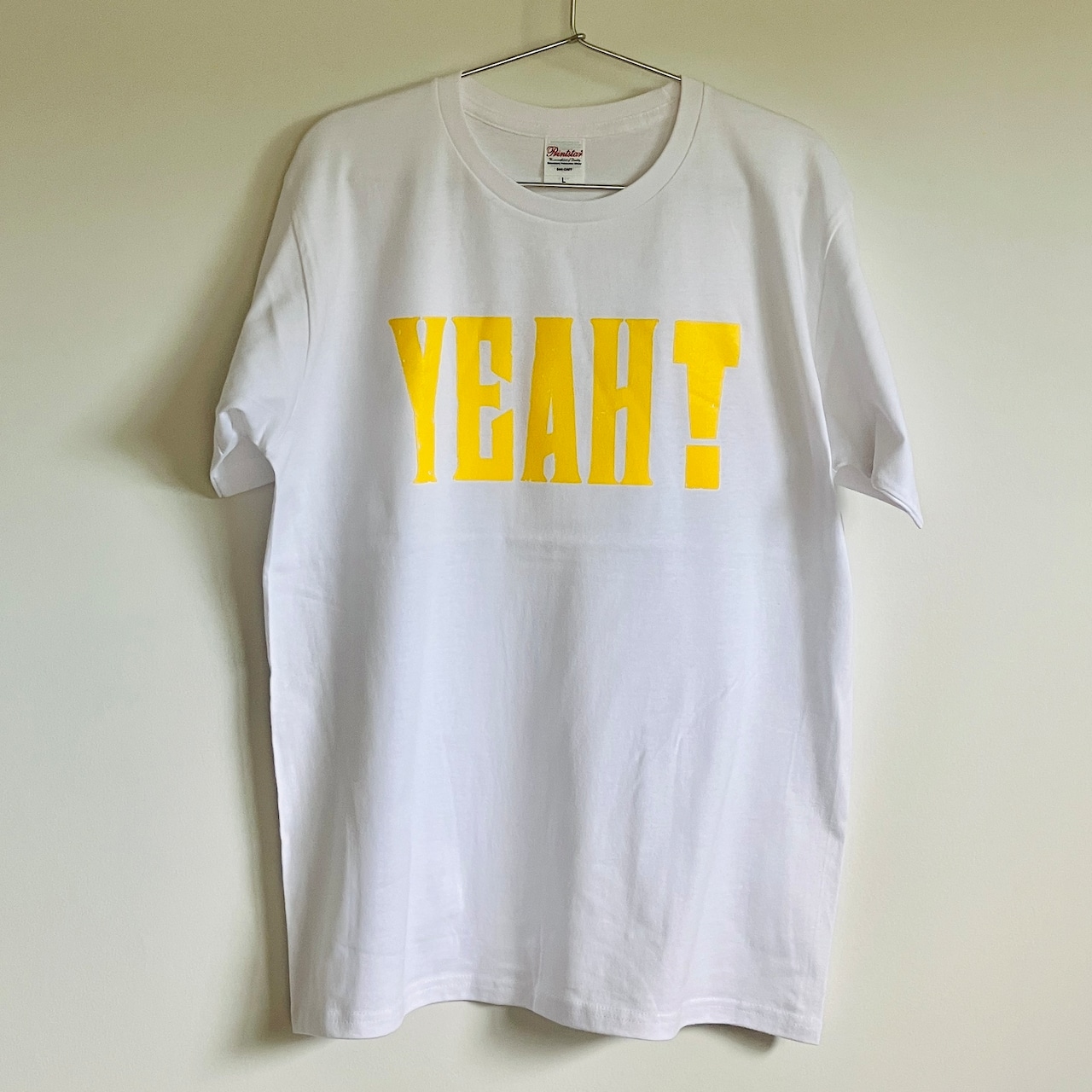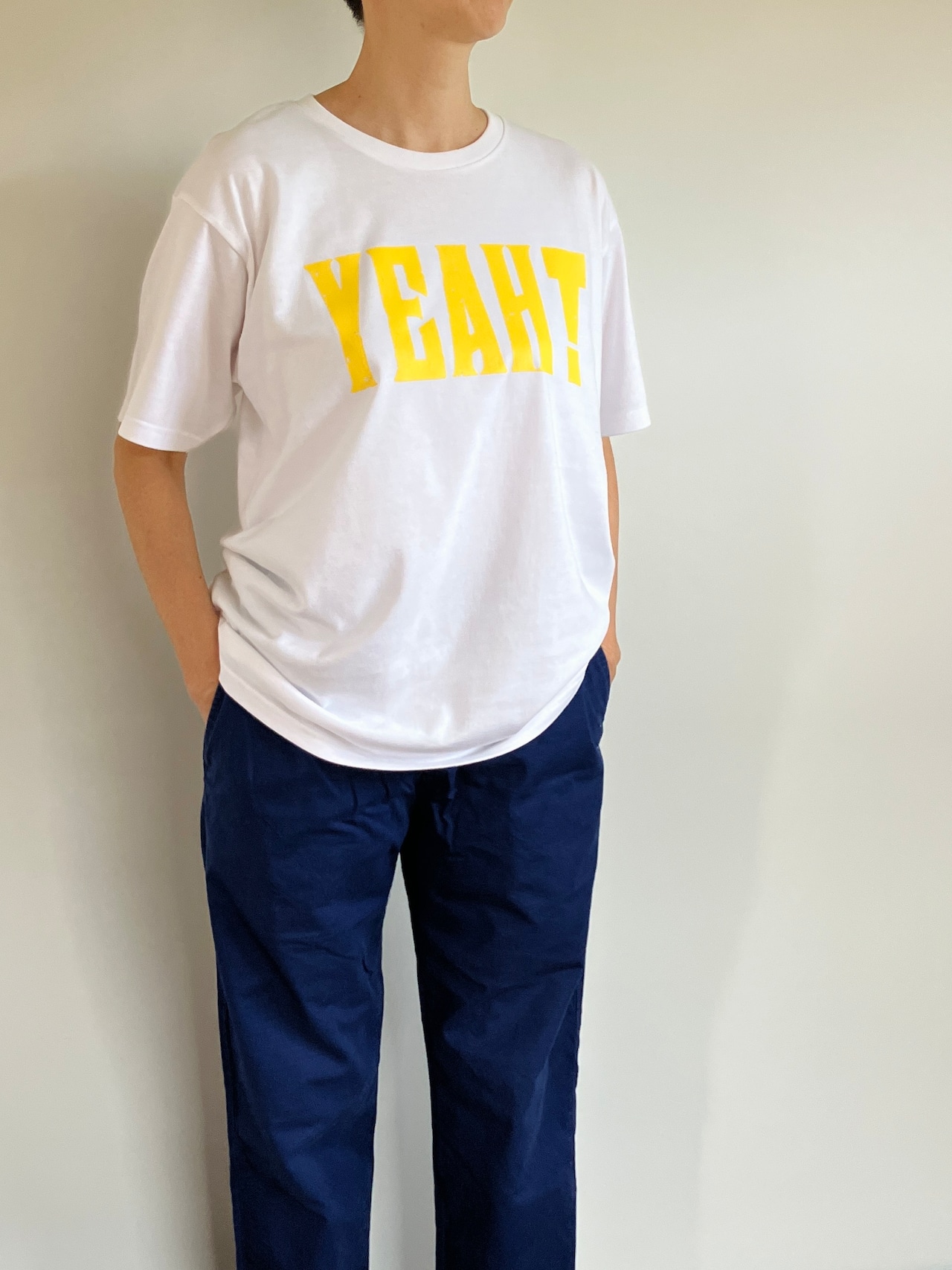 鮮やかなイエローで大きくプリントされた「YEAH!」の文字はシンプルながらも存在感抜群。