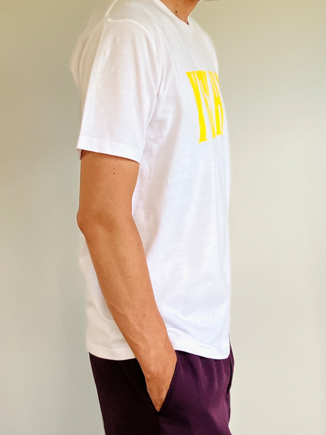 ホワイトのTシャツにパッと明るいイエローの文字が映えて、元気に着こなせる一枚です。