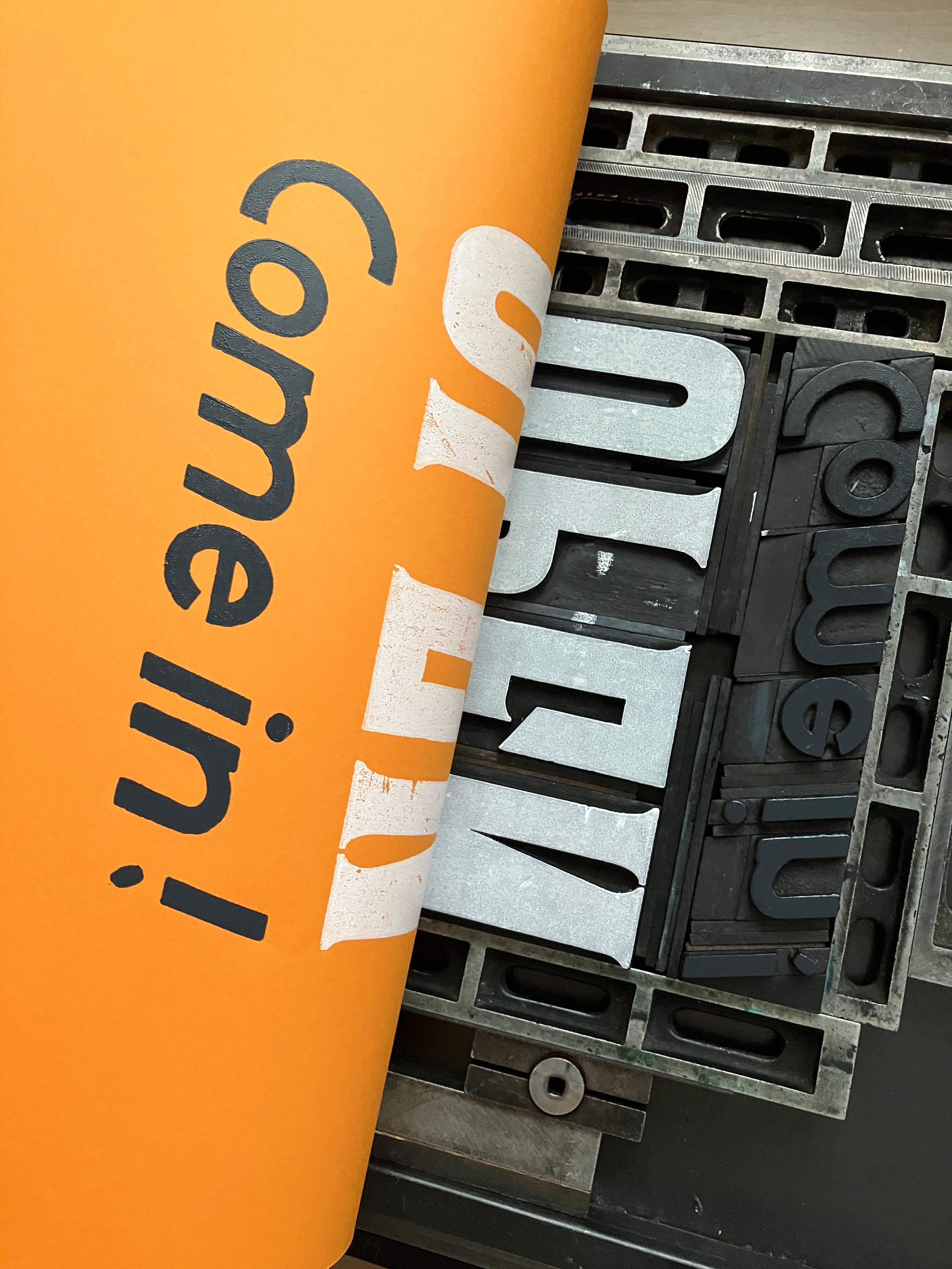 ・活版印刷は凸版印刷の一種で、印刷するときに木活字の上に紙を乗せてプレスすることで、活字のインクを紙にうつします。紙の上から圧をかけるため、木活字の当たる部分の紙にへこみやしわができる場合があります。