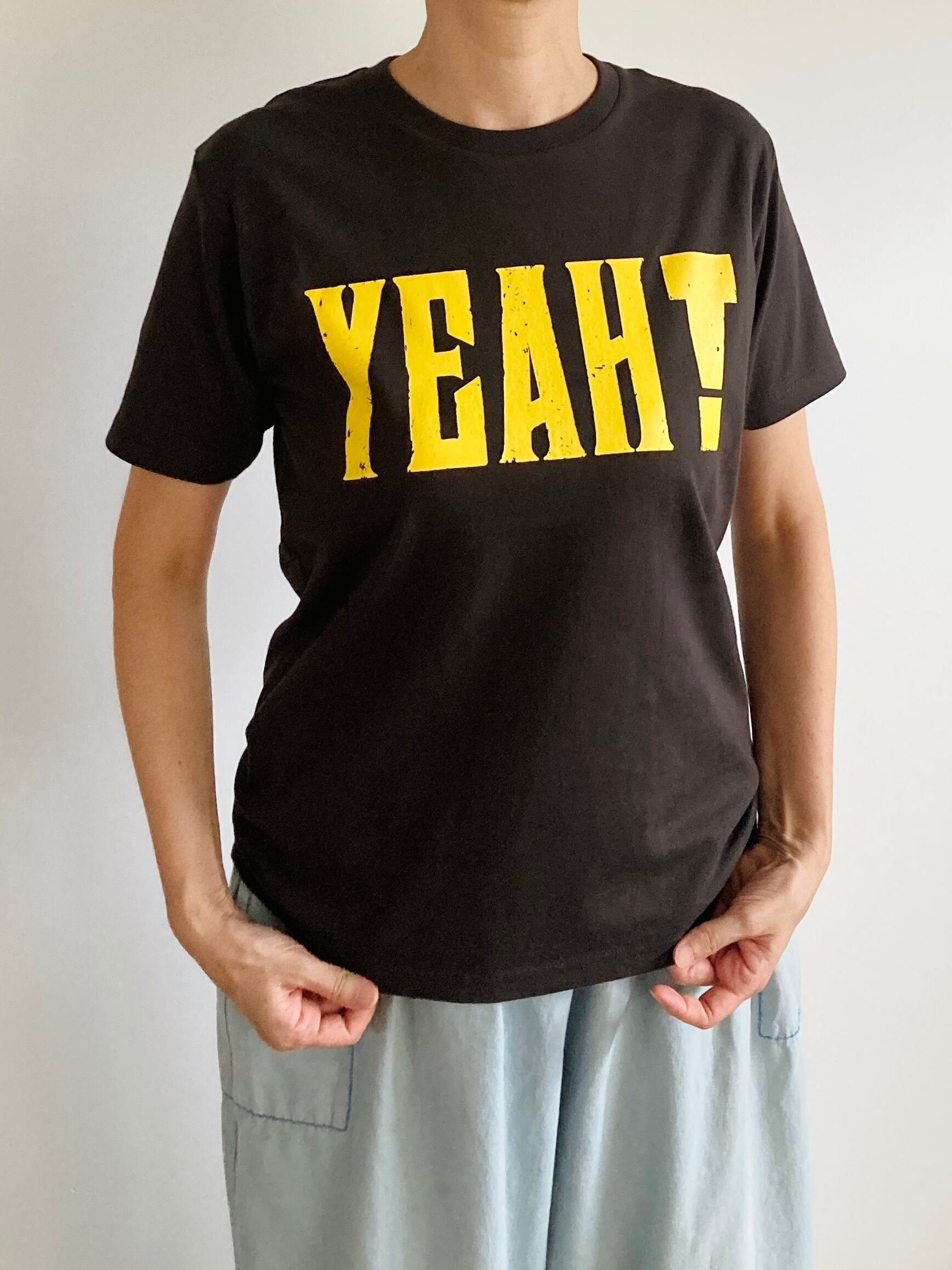 鮮やかなイエローで大きくプリントされた「YEAH!」の文字はシンプルながらも存在感抜群。