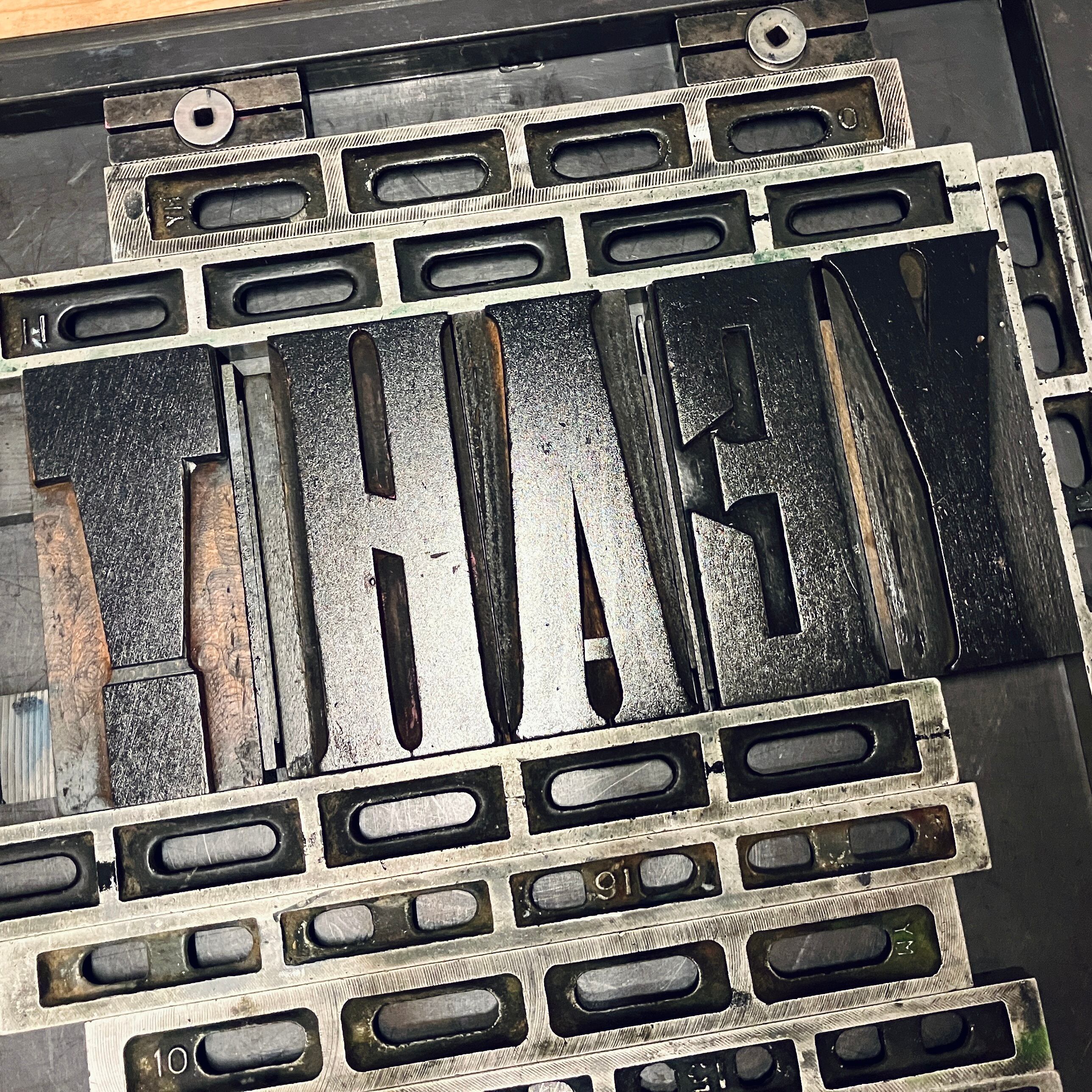 Tシャツには古い木活字で活版印刷した文字が、木のかすれた風合いそのままにシルクスクリーンプリントされています。
