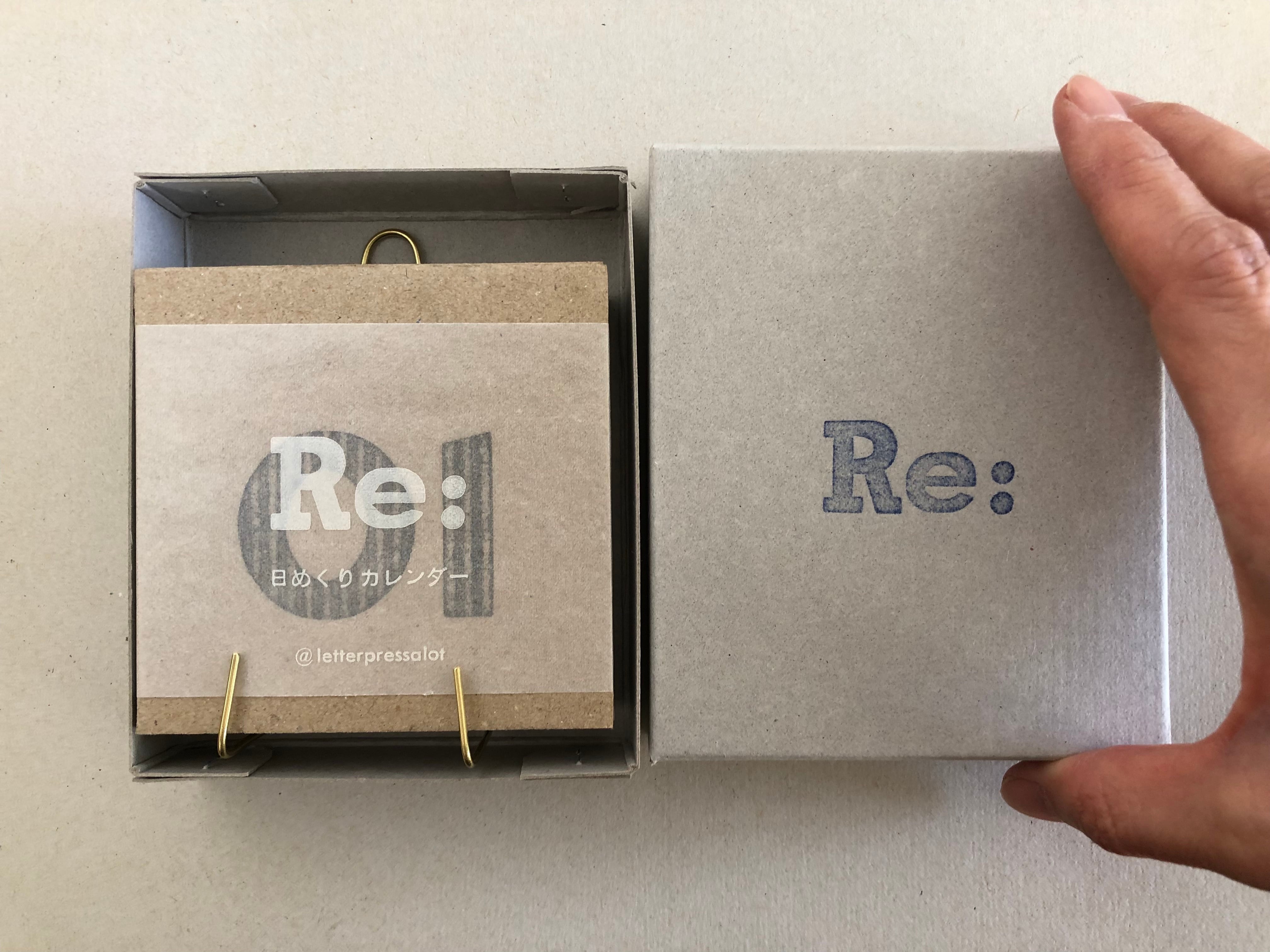 また、保管に便利なオリジナルの箱に入れてお送りします。シンプルなグレーの箱に木活字で「Re:」と印刷しました。