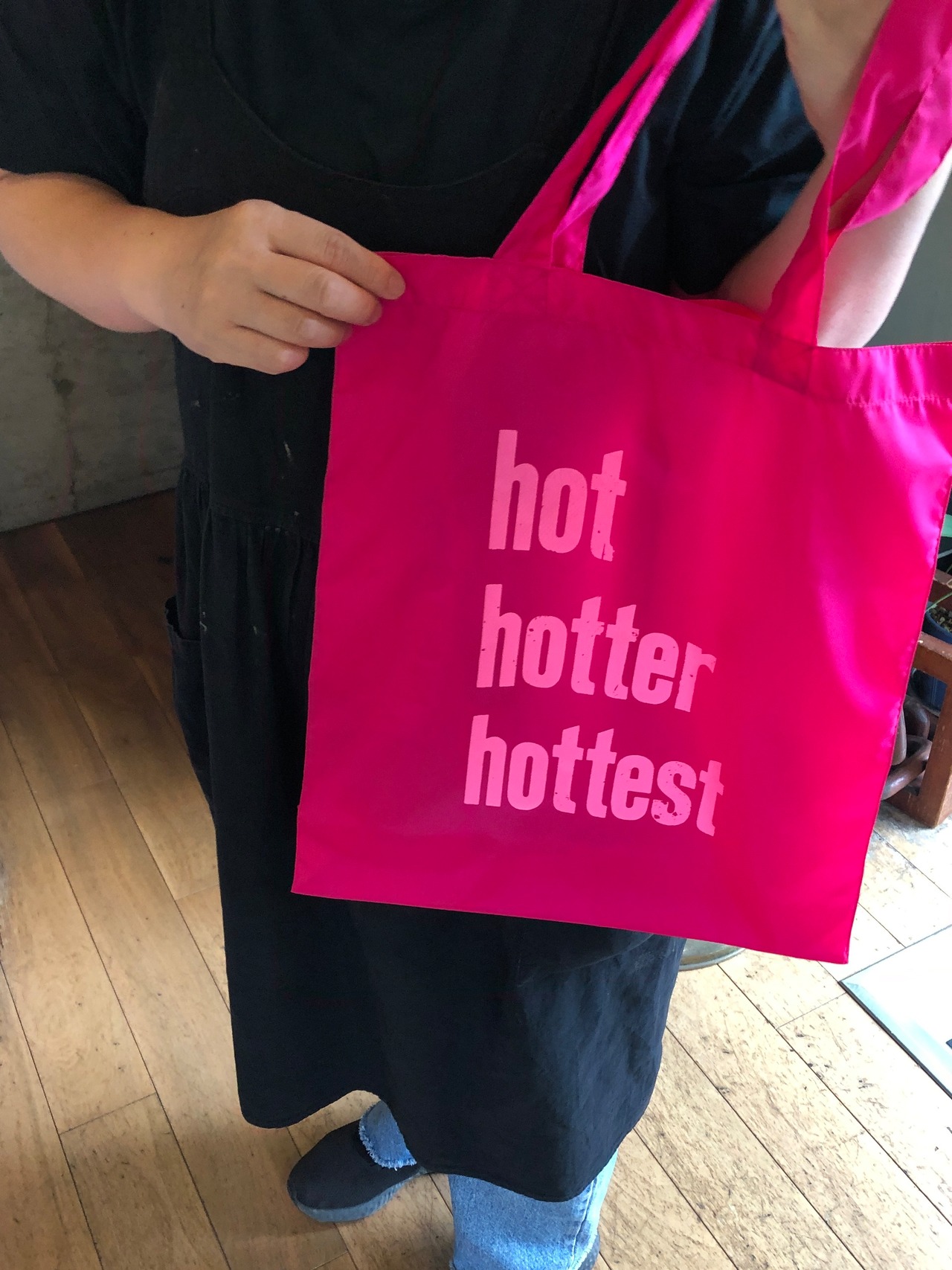バッグには、活版印刷した文字「hot hotter hottest」を蛍光カラーでシルクスクリーンプリントしました。カラフルなネオンカラーに気持ちも上がるビビッドな色展開です。