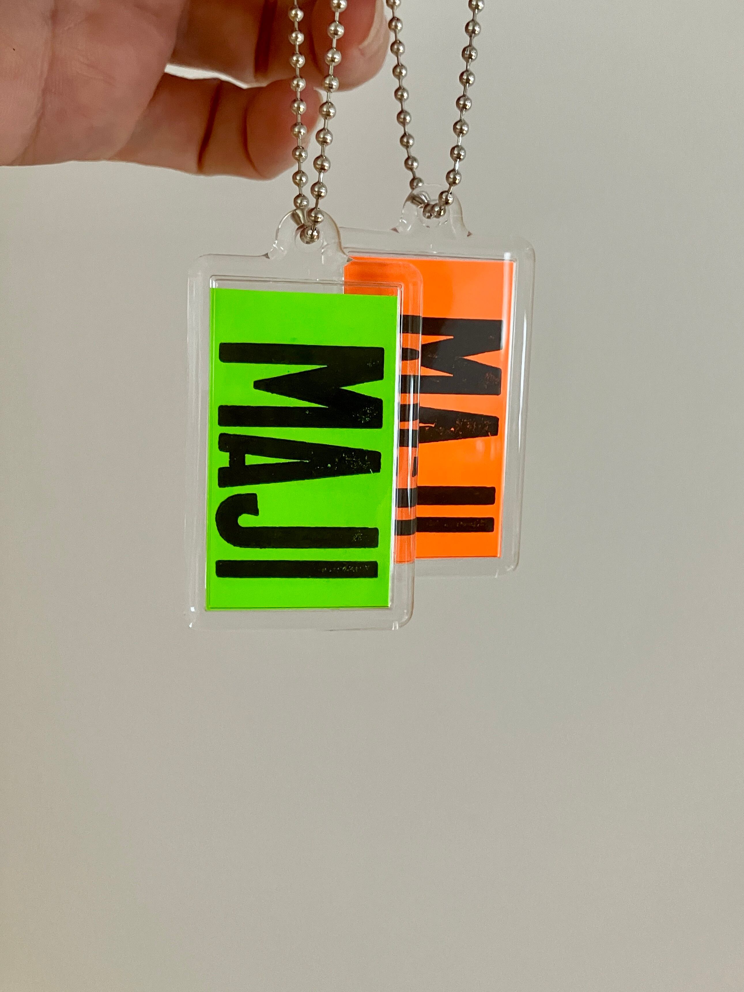 MAJIの文字は木活字を使って手刷りで活版印刷しています。木活字ならではのかすれた風合いをお楽しみください。蛍光カラーのビビッドな色の紙に黒インクで印刷した文字が映えて、バッグに付ければワンポイントのアクセントに!