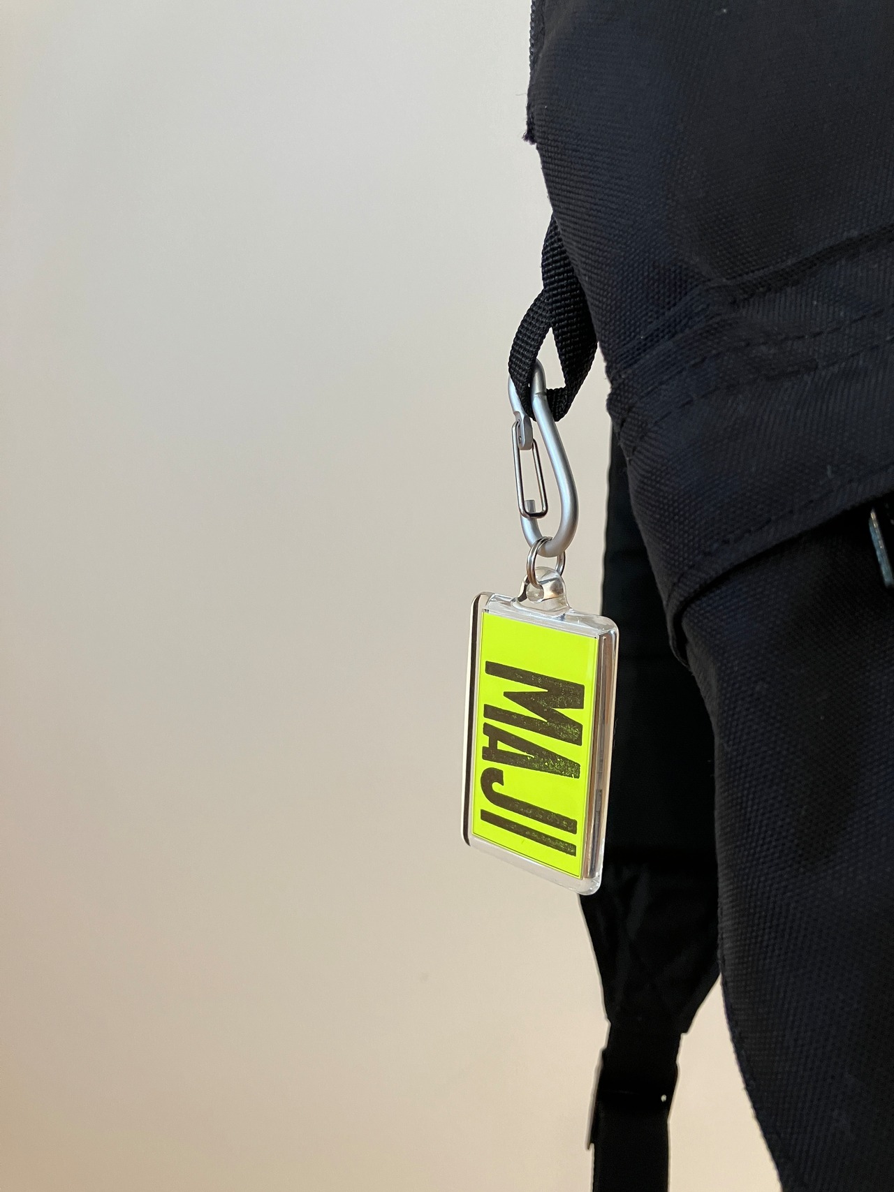 蛍光カラーに活版印刷された「MAJI」の文字が目をひくキーホルダーです。カラーは蛍光グリーン。