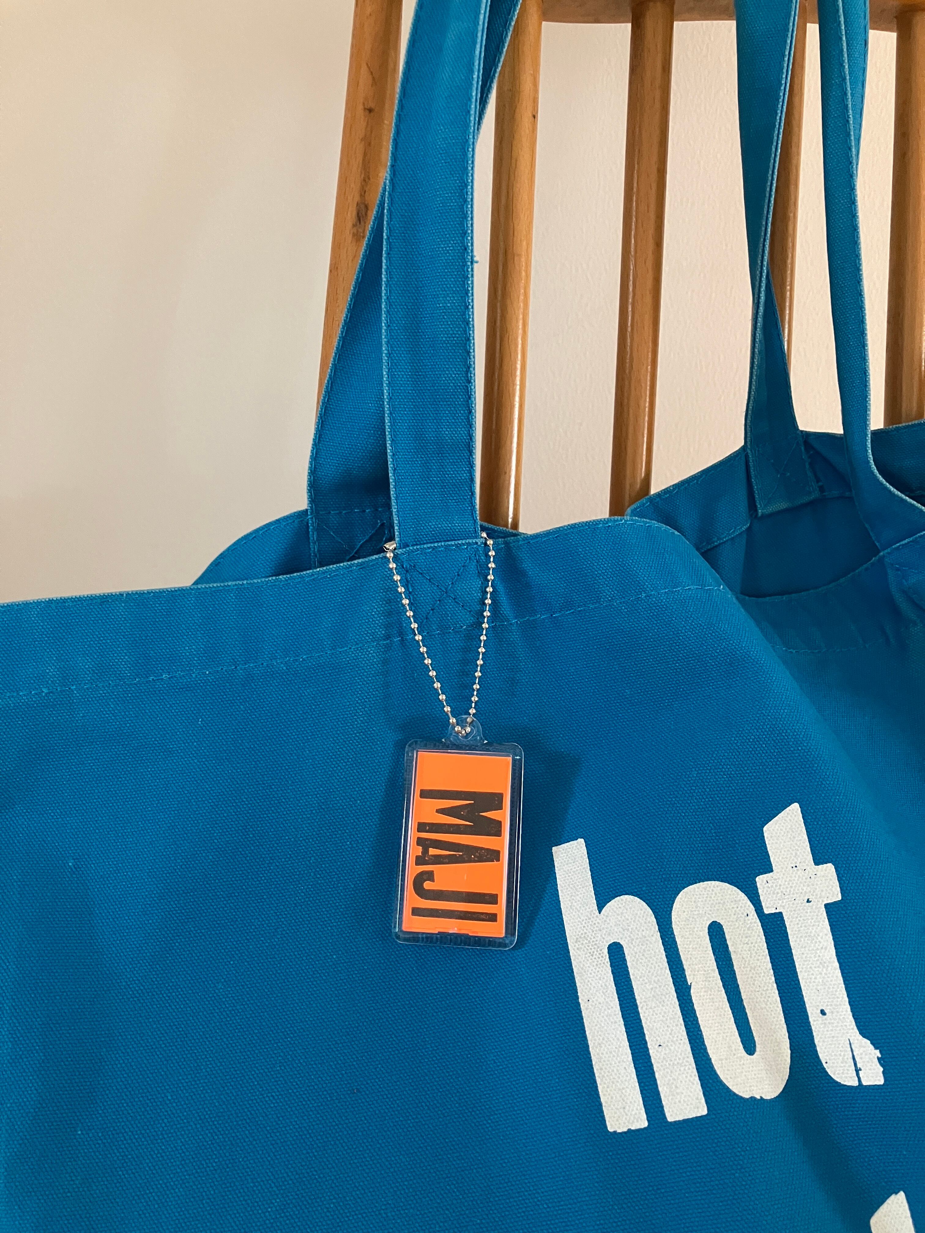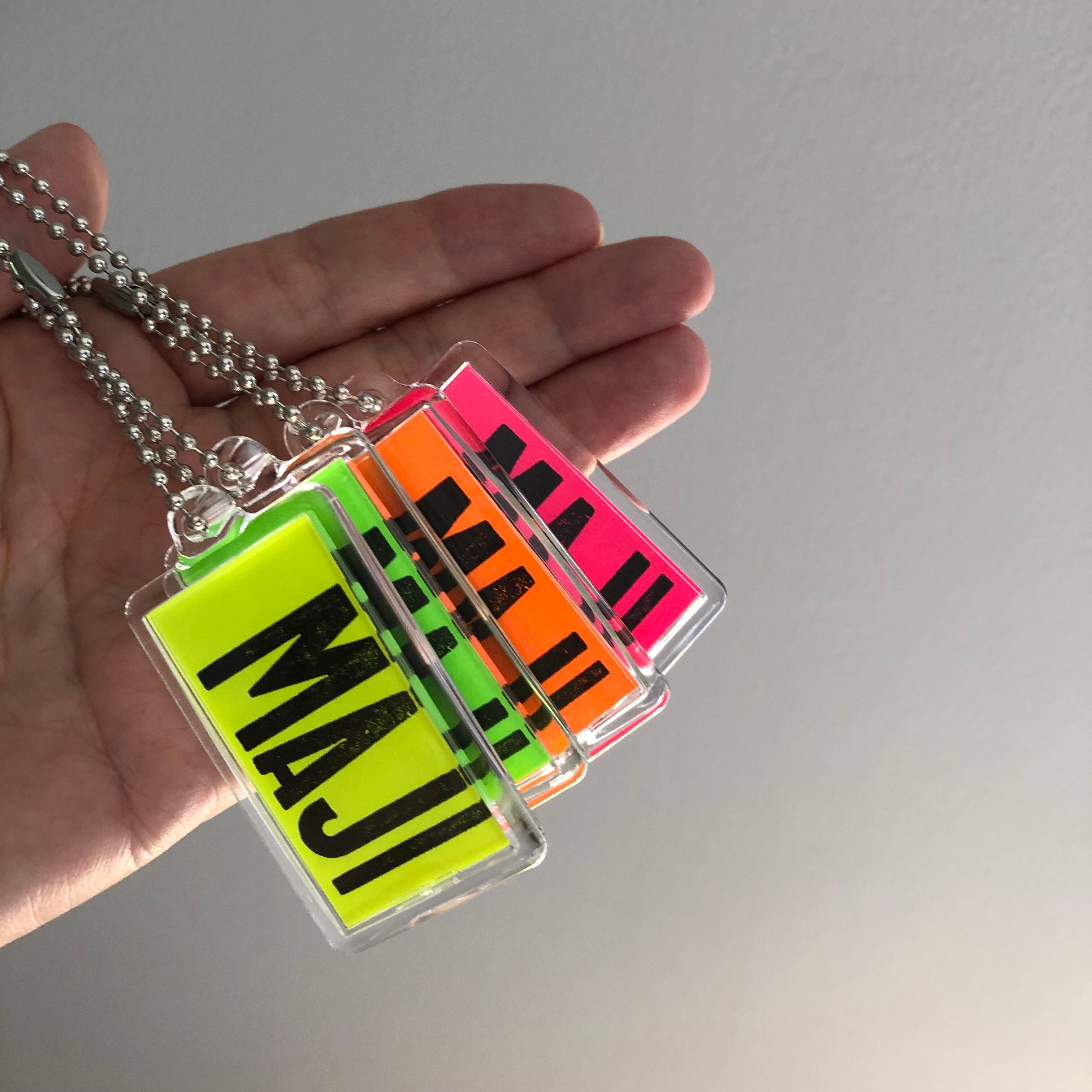 MAJIの文字は木活字を使って手刷りで活版印刷しています。木活字ならではのかすれた風合いをお楽しみください。蛍光カラーのビビッドな色の紙に黒インクで印刷した文字が映えて、バッグに付ければワンポイントのアクセントに!