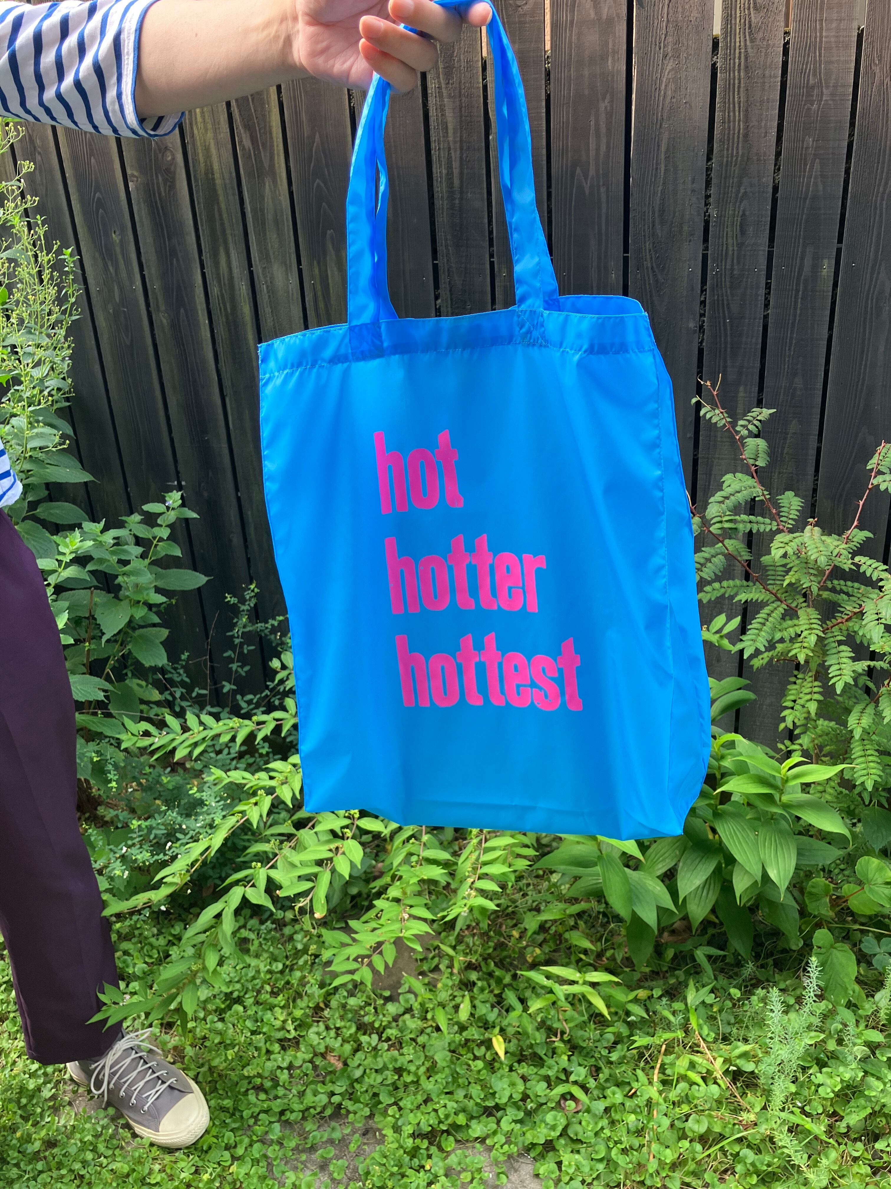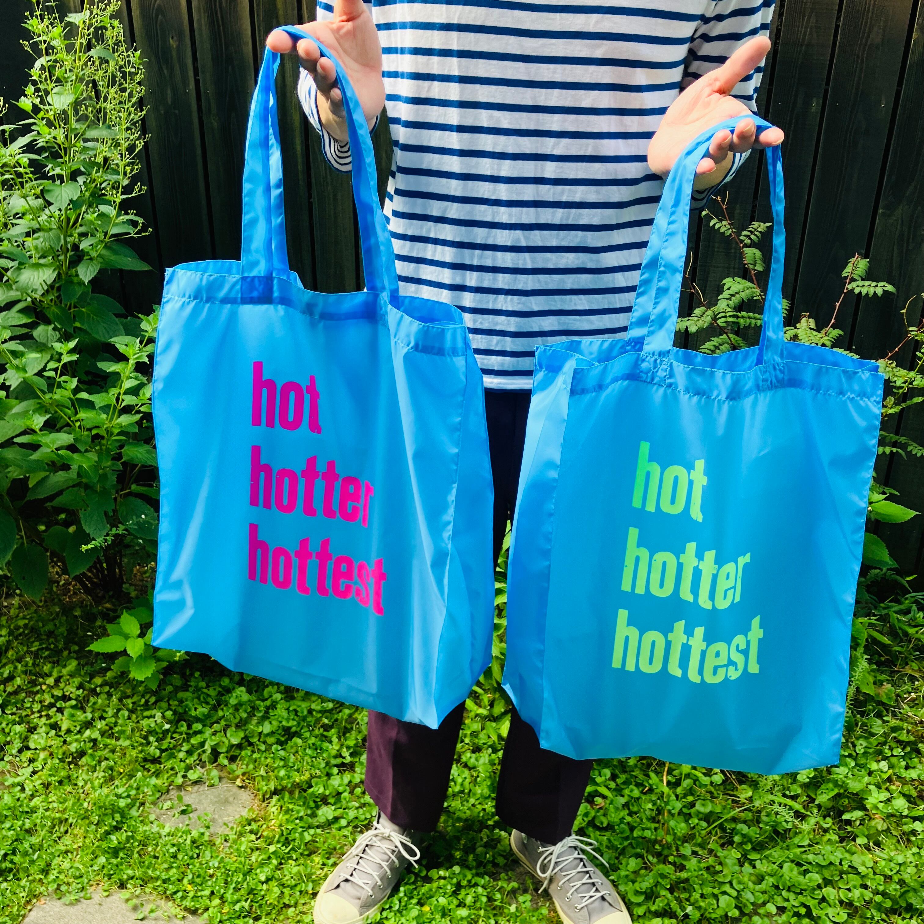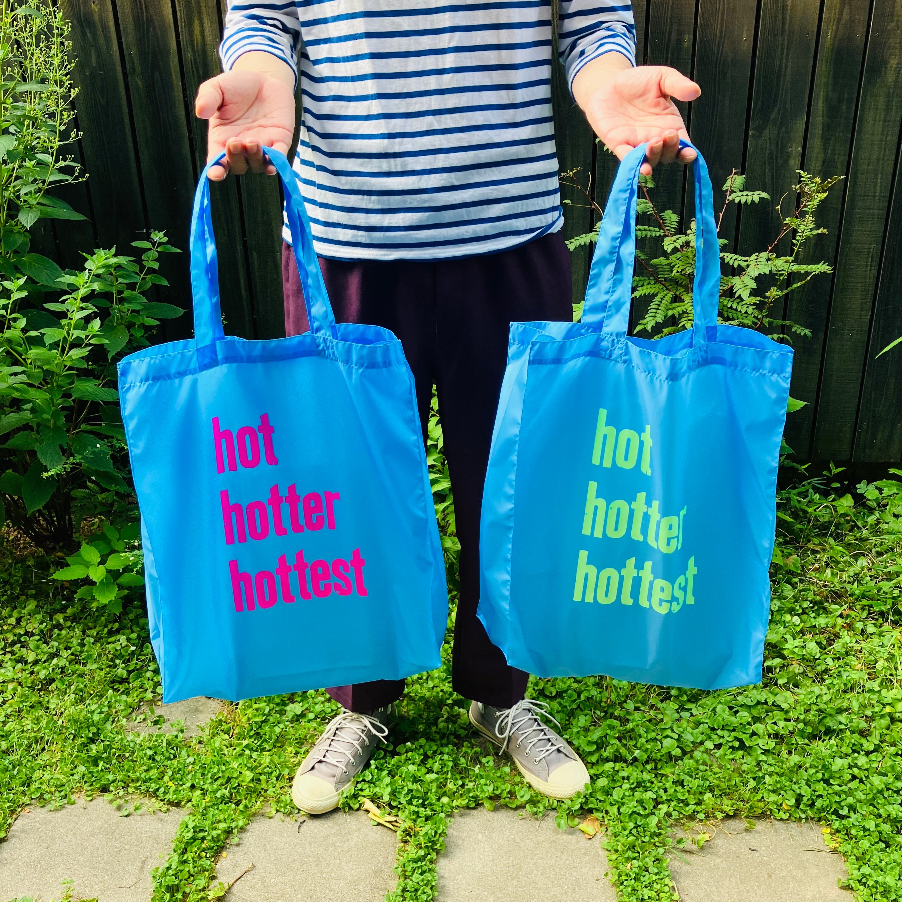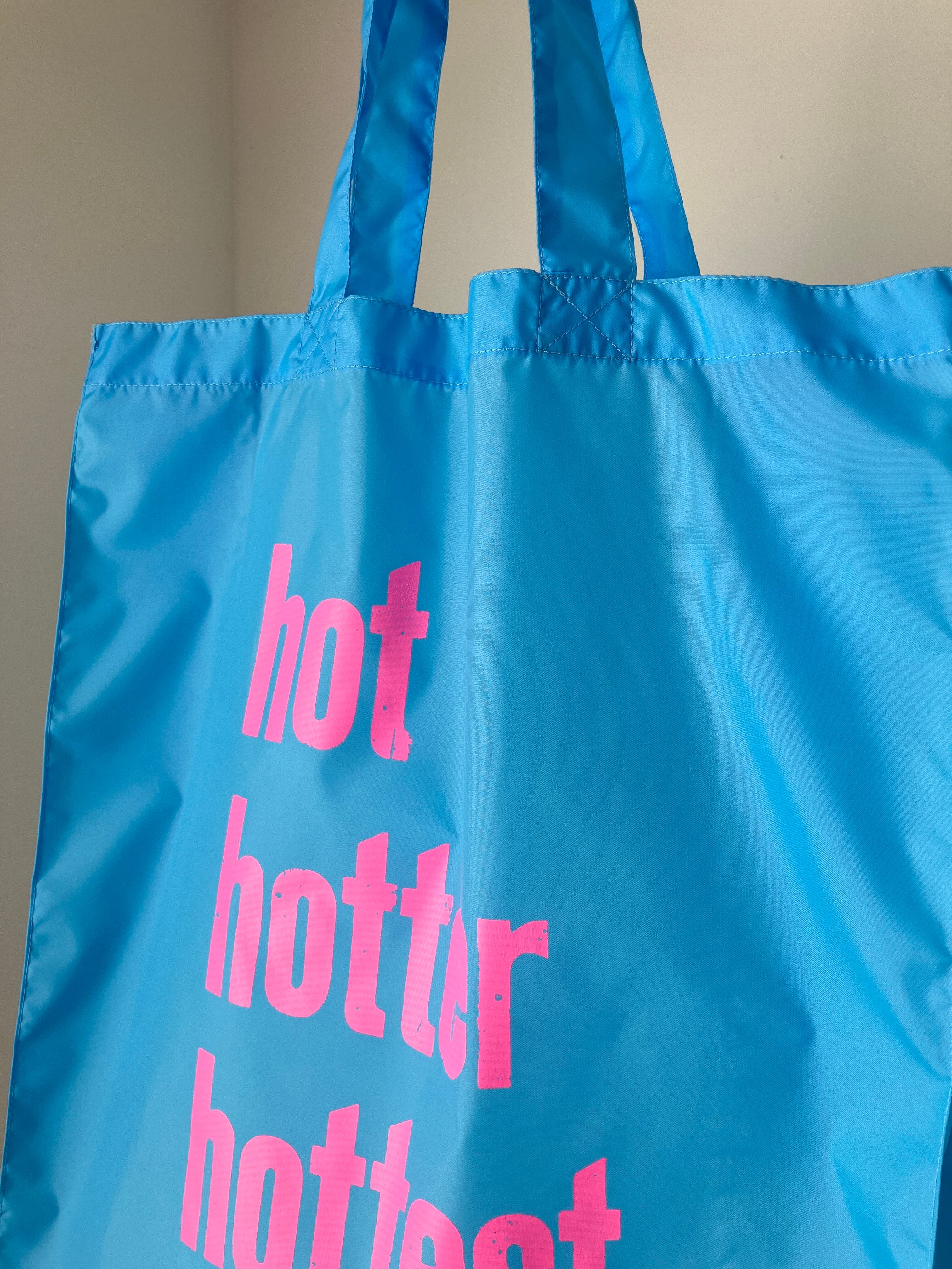 明るい蛍光ピンクのhothotterhottestの文字がよく目立つ、カラフルでポップな印象のバッグです。