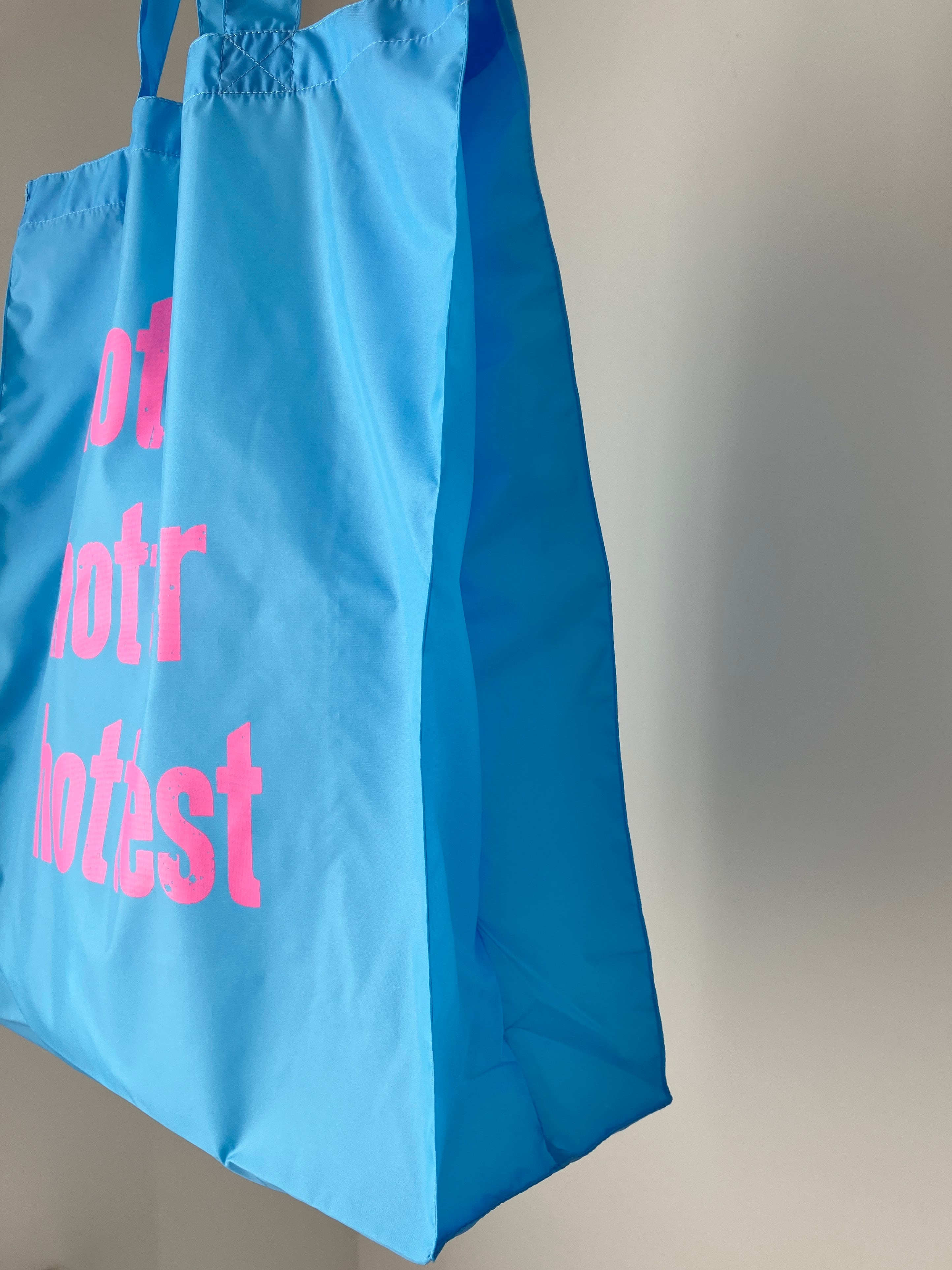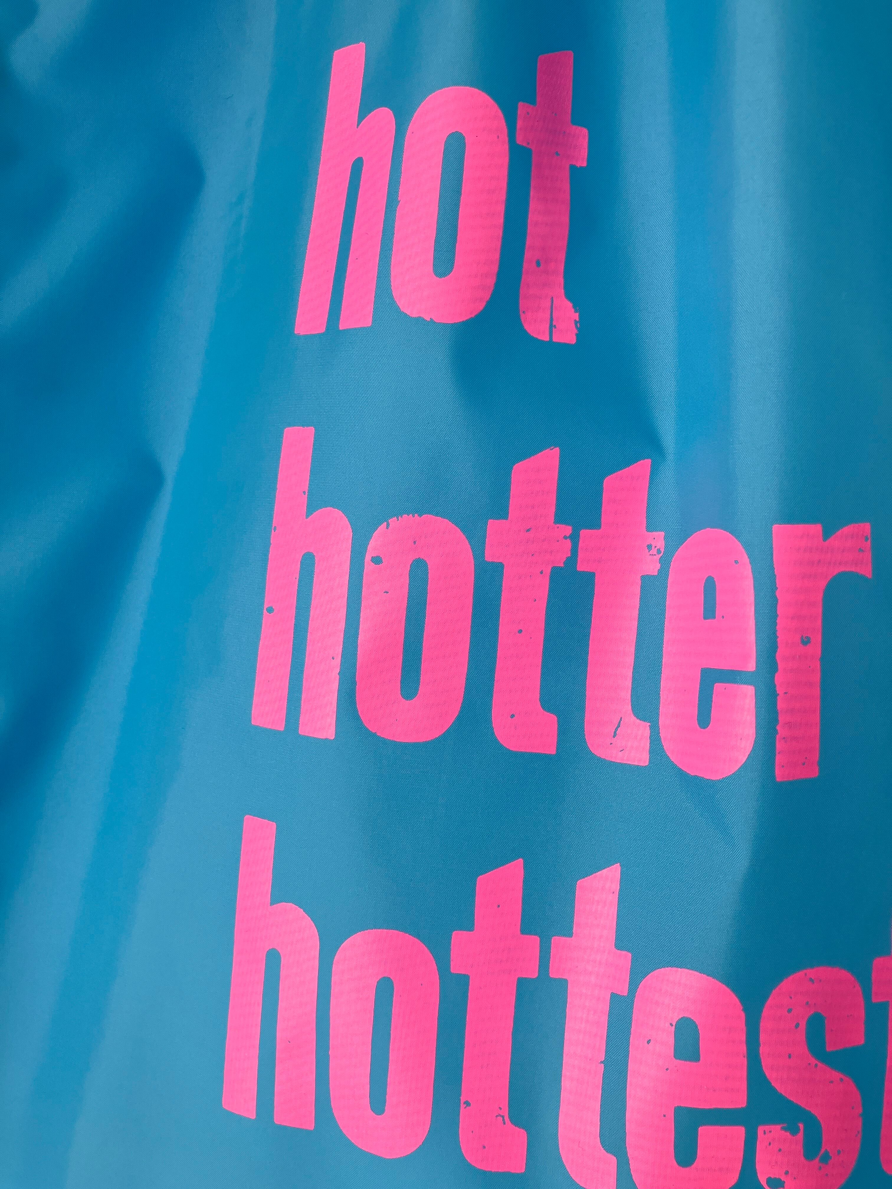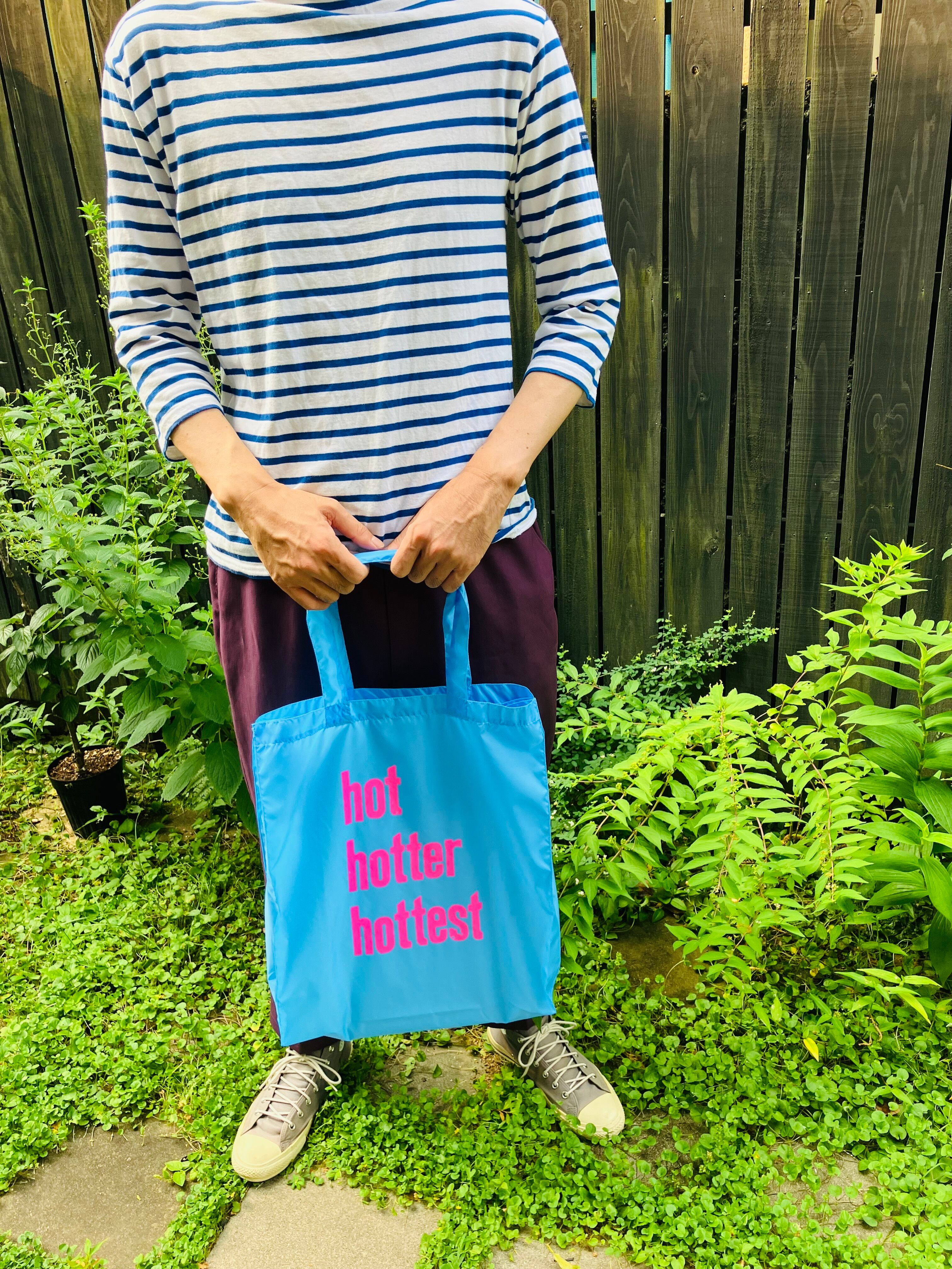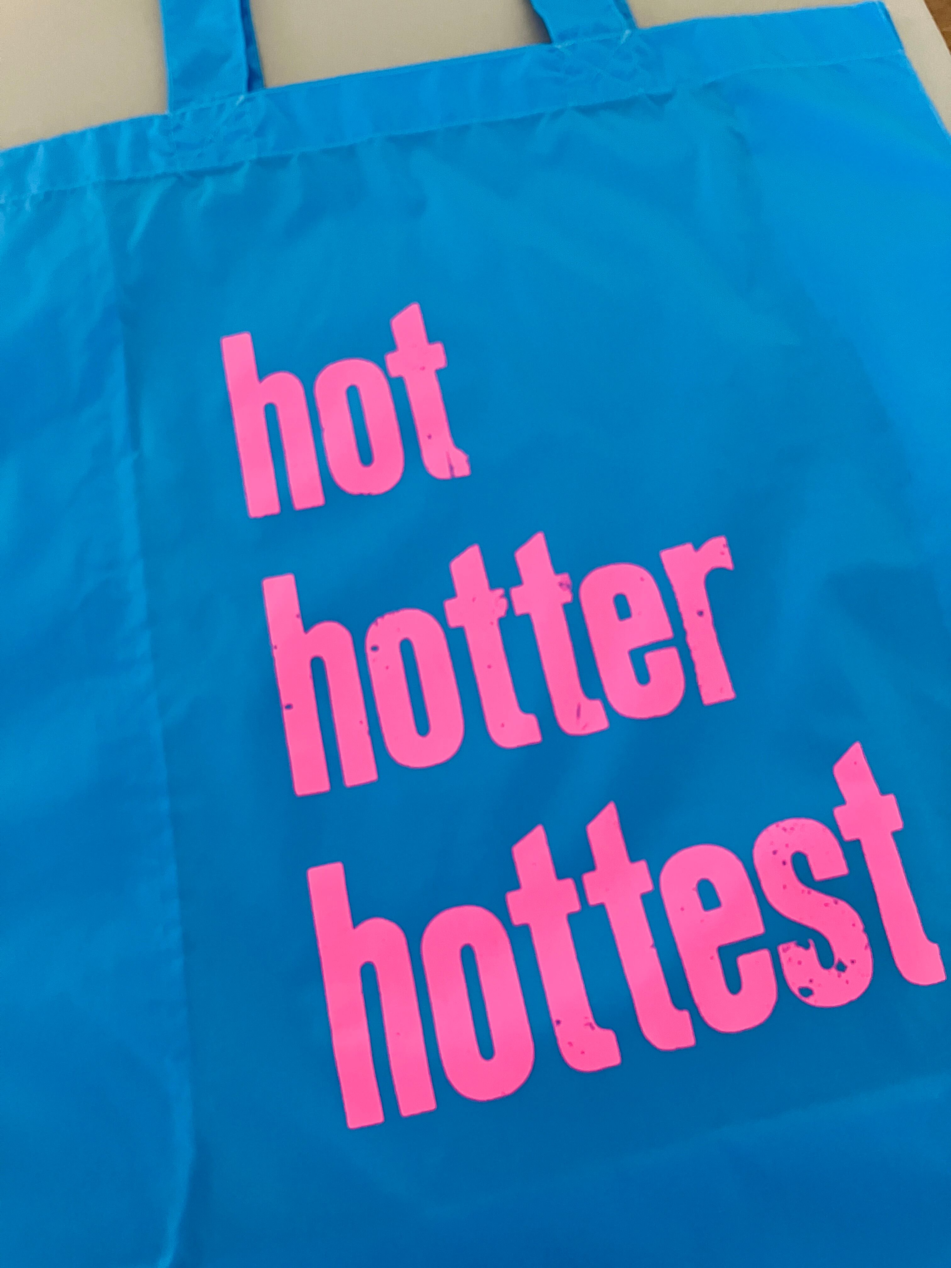 明るい蛍光ピンクのhothotterhottestの文字がよく目立つ、カラフルでポップな印象のバッグです。