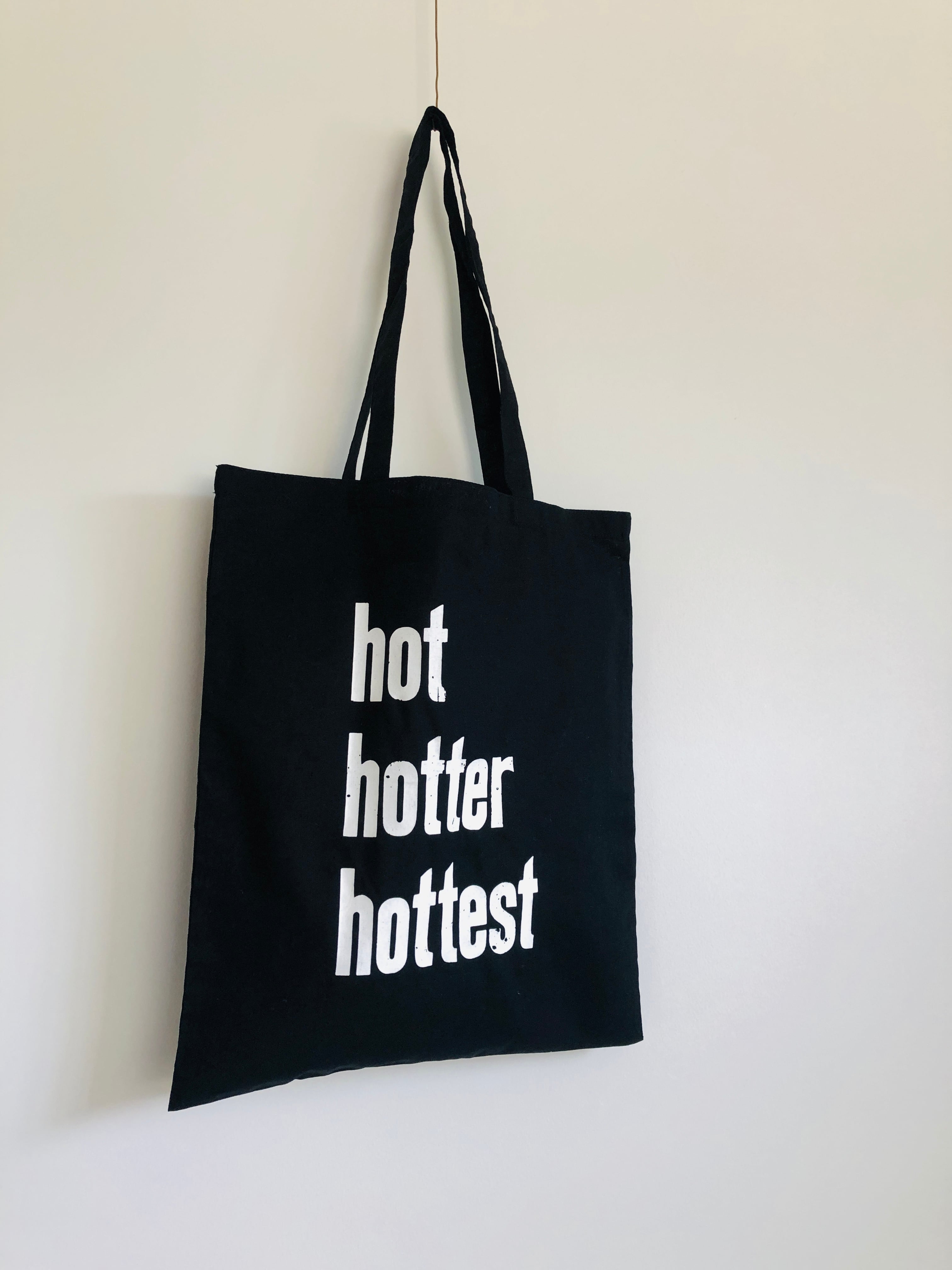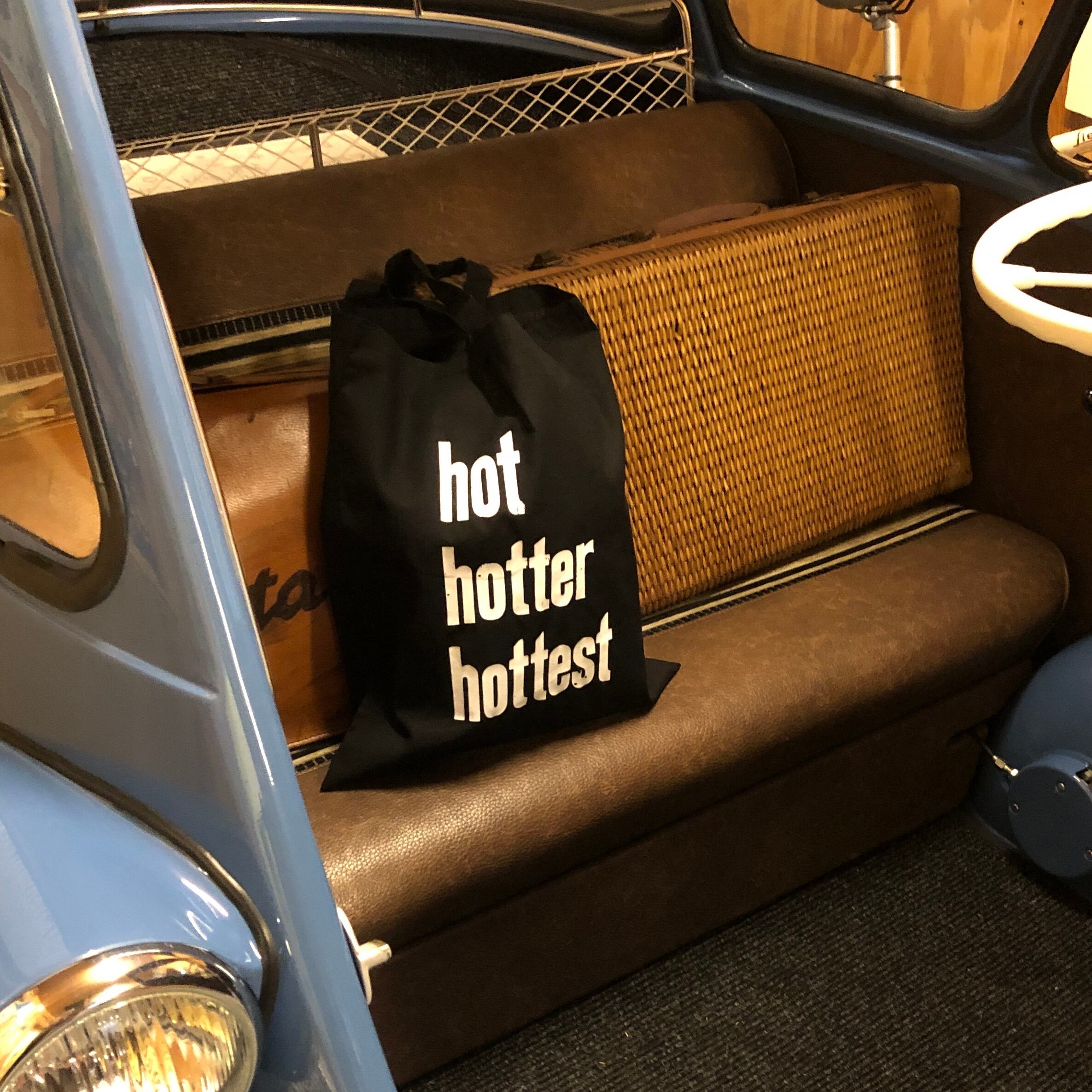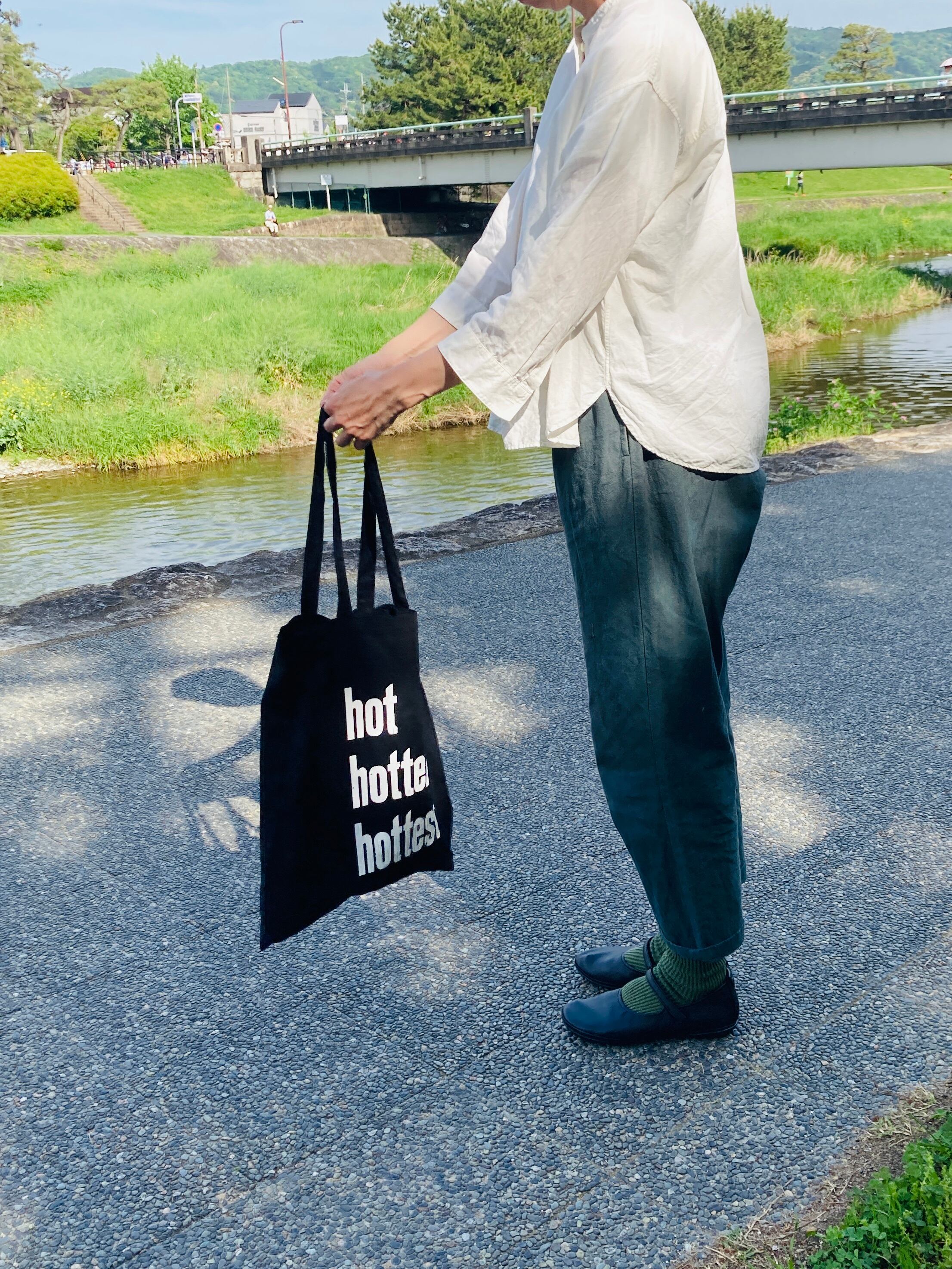 バッグには木活字で活版印刷したhot hotter hottestの文字をシルクスクリーンプリントしました。木活字ならではのかすれた文字が魅力です。