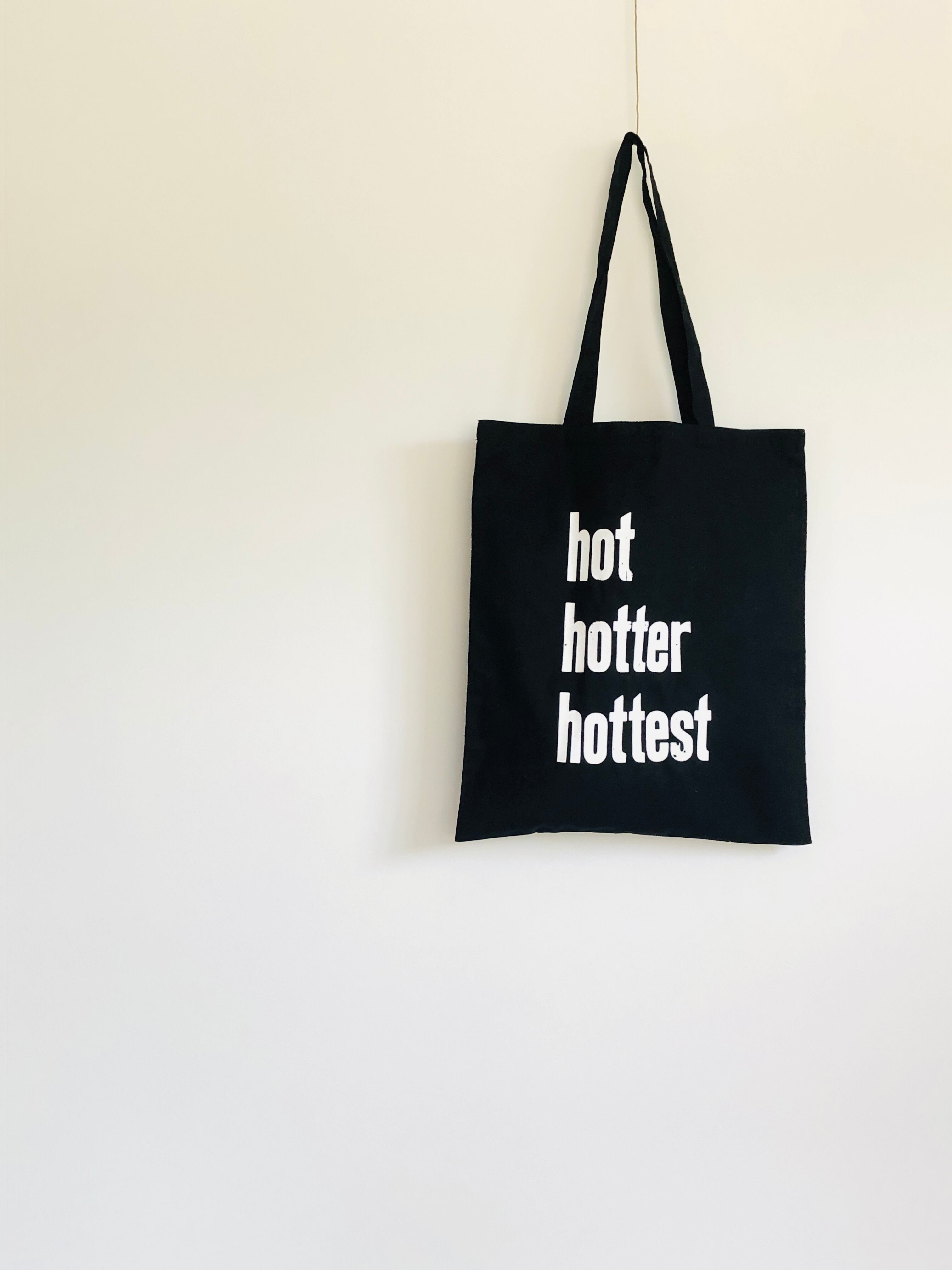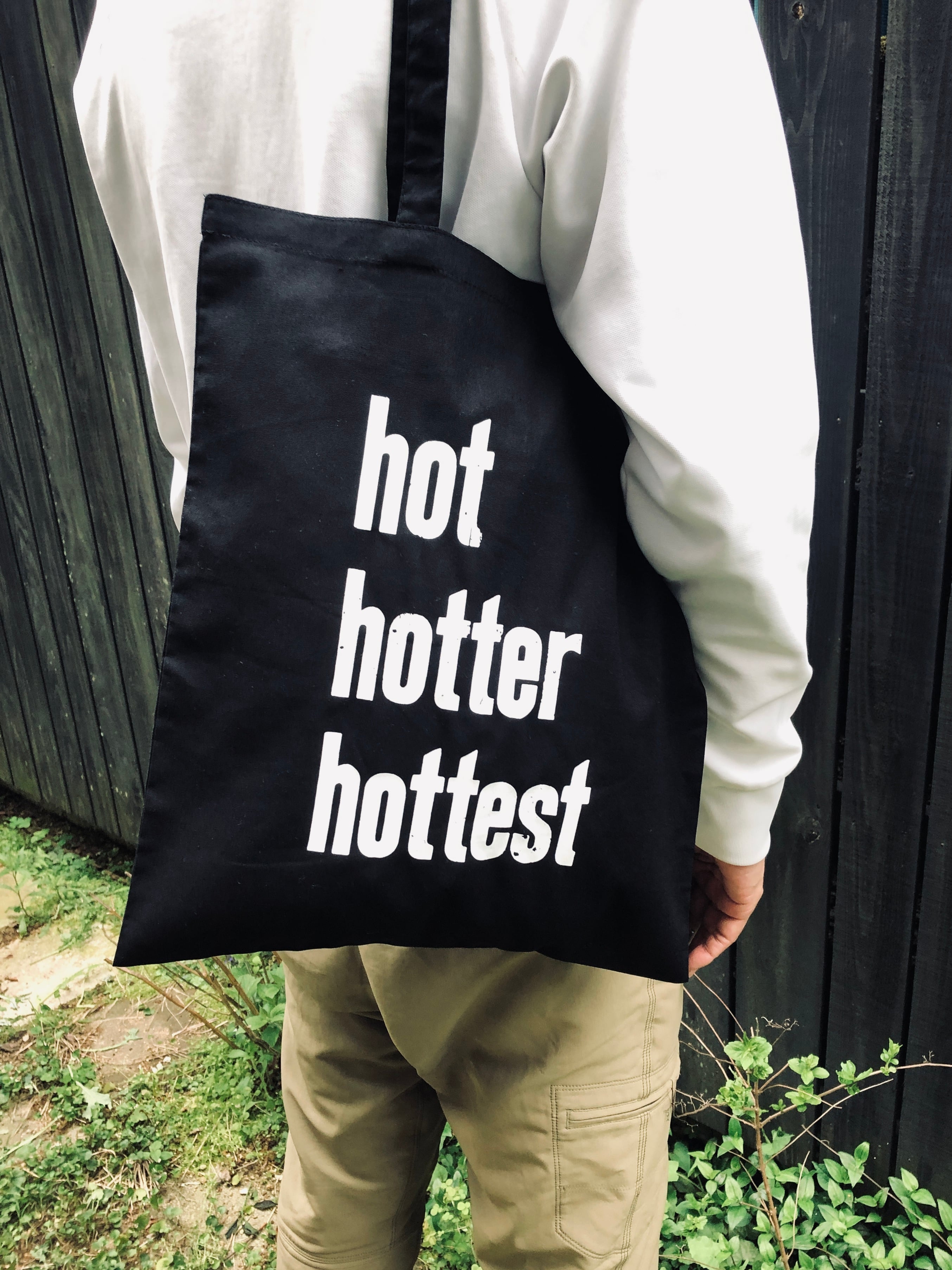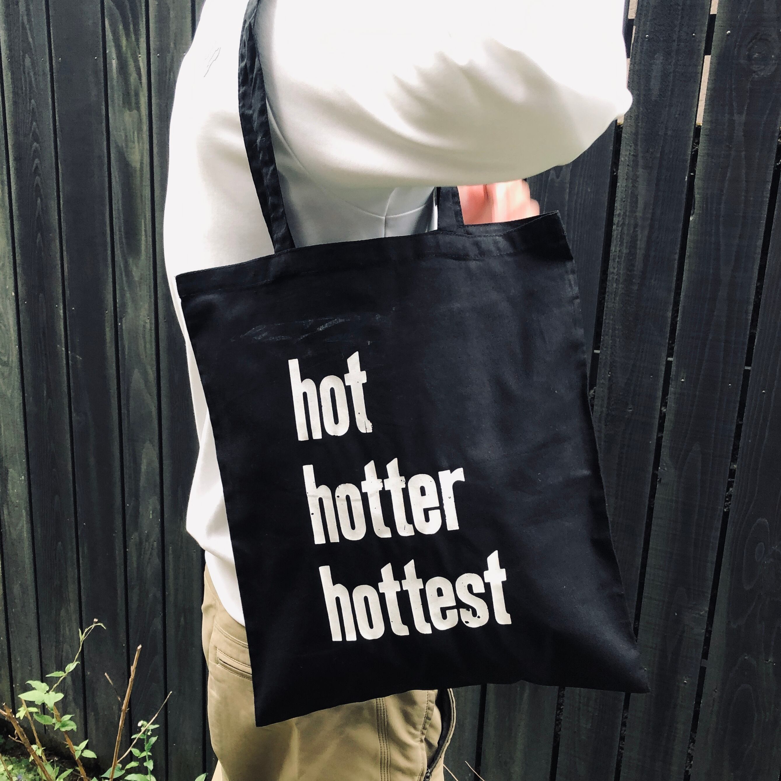 バッグには木活字で活版印刷したhot hotter hottestの文字をシルクスクリーンプリントしました。木活字ならではのかすれた文字が魅力です。